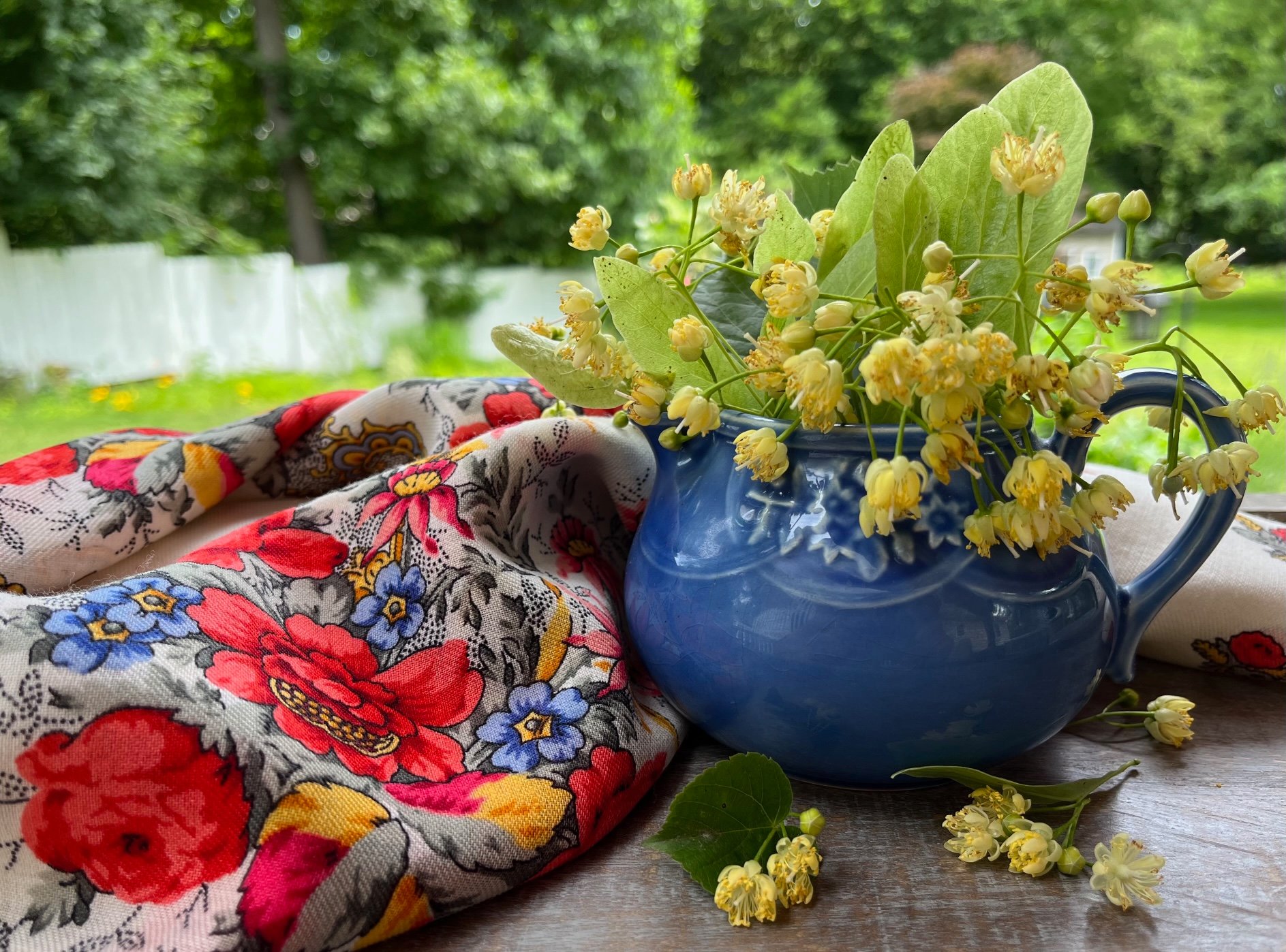 Июль. По-белорусски лiпень, месяц цветения липы. Запах липы до боли родной. Вспоминается знойный июльский полдень и благоухающие вековые липы вдоль дороги, ведущей к могиле прабабушки на далеком деревенском Белорусском кладбище. Нежнейший платочек 89х89 Родной Напев 1900-0.