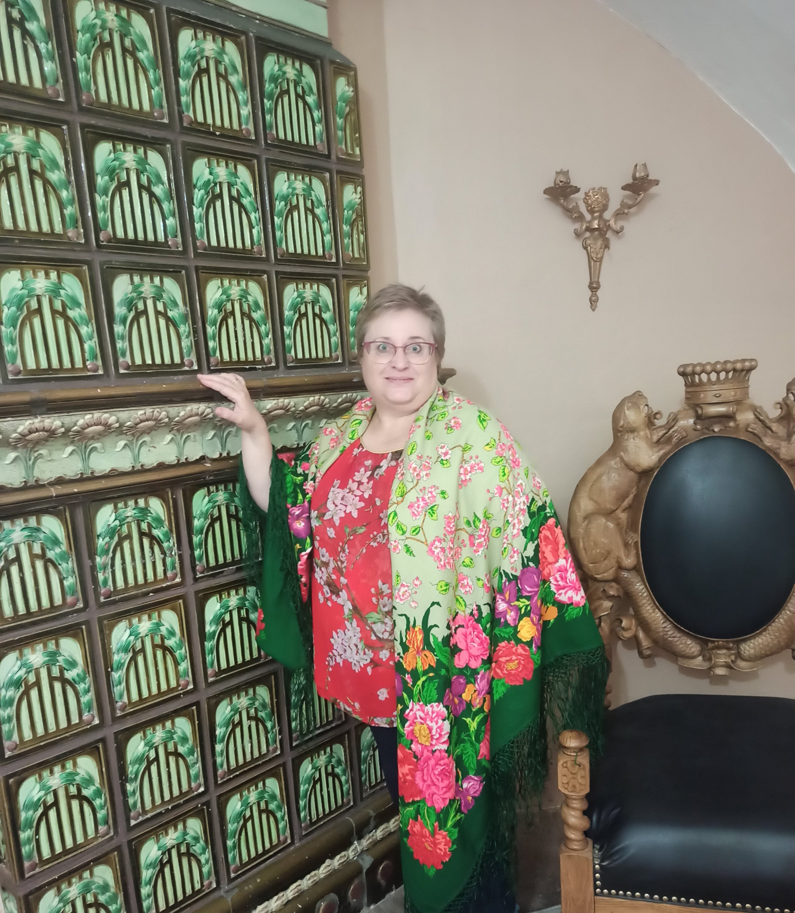 Цветущий сад-30 Лидии Шаховской. Была на экскурсии в усадьбе графов Бобринских, в г. Богородицке. Красивая усадьба, природа! Изразцы камина оказались точно в оттенке этой шали, пройти мимо не смогла.