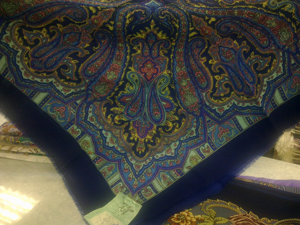 Маловато информации - хотя бы размер платка,бахрома? А ещё ст.метро? эх, не видно его было, под сумкой лежал, так что размер не скажу, насчет бахромы рискну предположить, что переделанная - на вид хлопковые некрученые нити, как мулине, только без отлива. дело было в 10 утра, м. Арбатская ;) честно ...