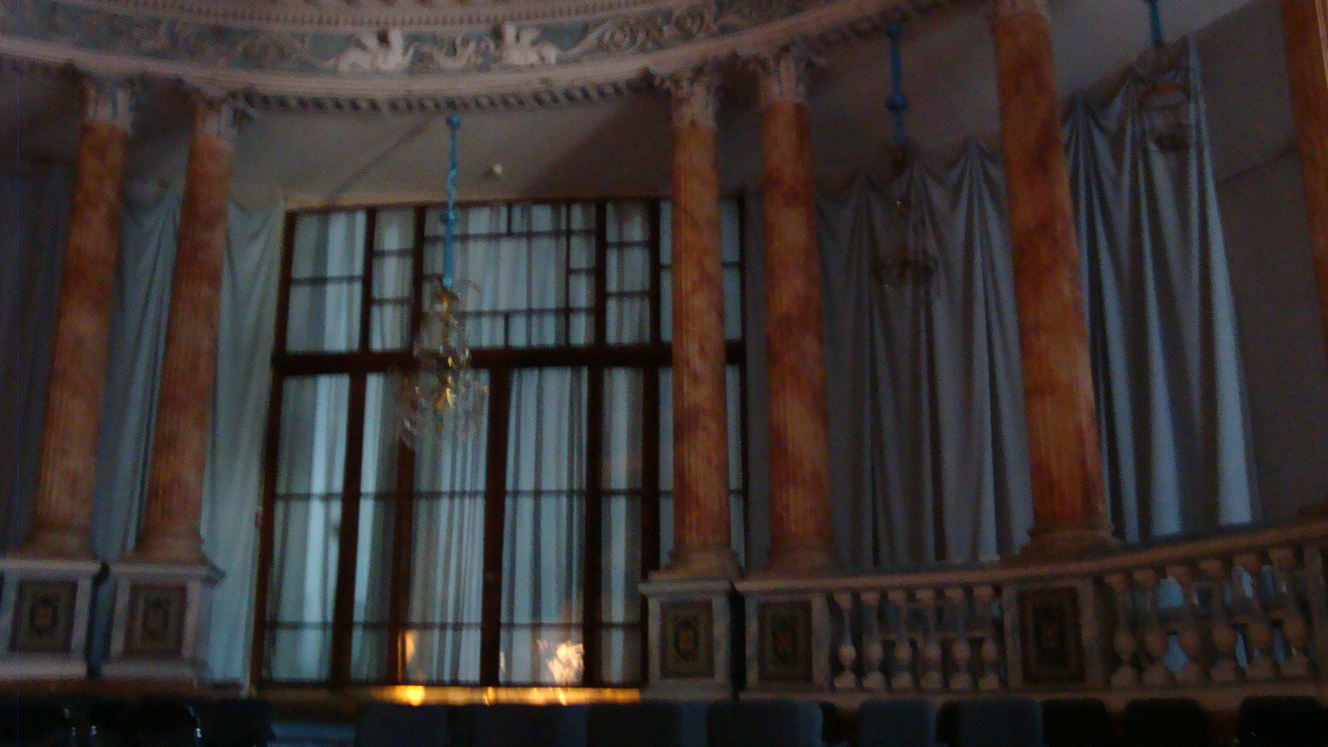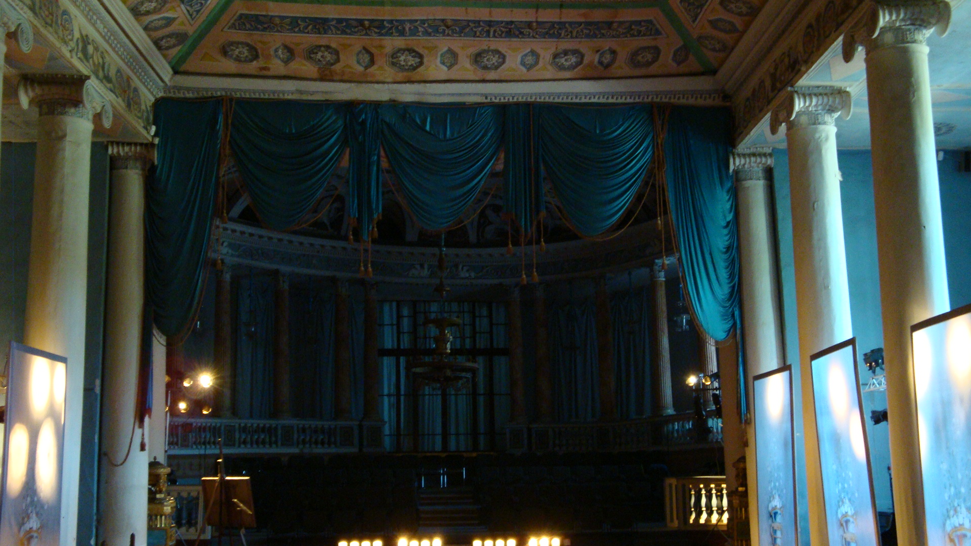 И вот наконец мы попадаем в театр! Театр представлен в бальном варианте. А раньше колонны (которые сделаны из дерева и картона) сдвигались, освобождая место для сцены. А в той части, где сейчас находится зрительный зал, разбирался пол и ставились диванчики для господ. Представьте удивление людей, которые танцевали в бальном зале с колоннами и ровными по всей площади полами, а затем, прийдя через час после прогулки, просто не могли понять, куда они попали. Потому что перед ними была уже не бальная зала, а настоящий театр с огромной сценой. Постановки крепостного театра были масштабны. Например, "Взятие Измаила", где были выстроенны огромные по размеру декорации крепости, горел за сценой настоящий огонь, шел дым, слышались выстрелы. Для смены декораций были построены специальные инженерные сооружения, которые частично сохранились до нашего времени. Нам показывали специальные желоба в стенах, по которым пускали воду, чтобы получить звуки идущего дождя, машину для получения звуков грома, было устройство с помощью которого сверху сыпали муку, изображавшую в свете свечей снег.