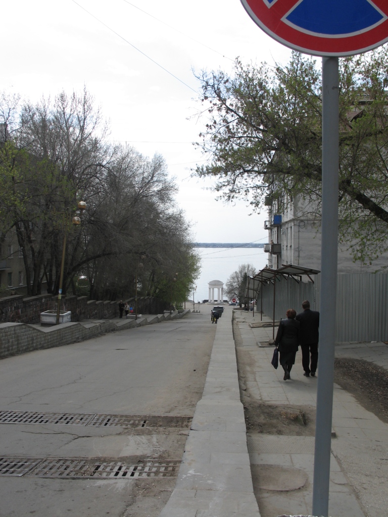 Вот отсюда, от Бабушкина взвоза, и начинается Набережная Космонавтов. Удивительно мы в Саратове живём. Город тянется вдоль Волги на 70 км, а выход к Волге только на этом небольшом (сравнительно) участке. Остальное застроено промышленными предприятиями, занято железной дорогой (опять же промышленной), всякими лодочными базами и автостоянками. Даже пляжа в городской черте нет. А у начала набережной стоит такая беседка-ротонда. Возле неё можно войти в воду, что и делают особо рьяные любители купания. Я сама брезгую.