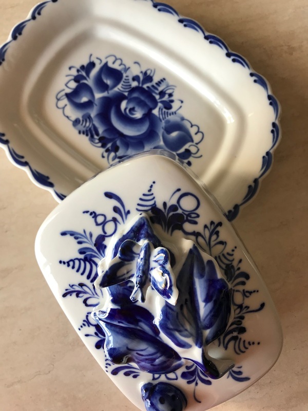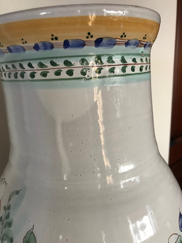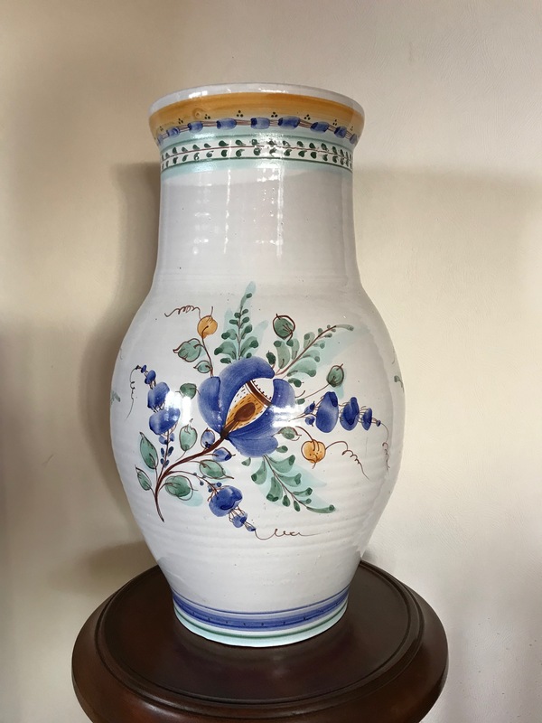 Из старого... довольно крупная ваза, можно сказать средняя--напольная. Купила в 1993 году ( как сейчас помню--за 300 руб), в Гжели, прямо на улице у одного из Гжельских мастеров. Тогда много товара выставлялось рядами вблизи магазинов. Ваза кривовата, не 1 сорта, полностью выполнена вручную--на гончарном круге. Почему то очень люблю ее .