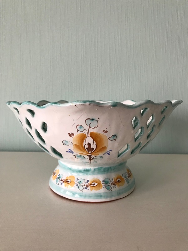 Нашла еще вчера Вазу для фруктов. Примерно, где то 1995 год. Одно время активно пользовалась ею по назначению и приходилось мыть часто. В результате , со временем ( через 10 лет) пошли трещины по эмали и кое- где крошка. Если майолику брать, то лучше что то интерьерное.
