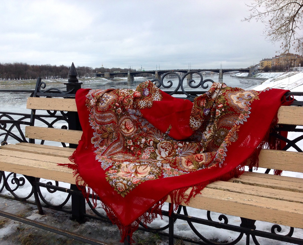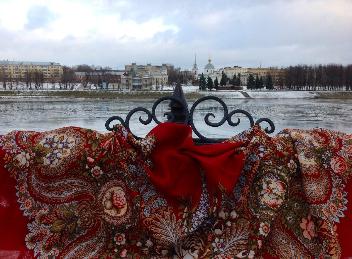 Вот мой новый красный платок (в моей любимой теплой гамме) на набережной реки Волги в Твери.