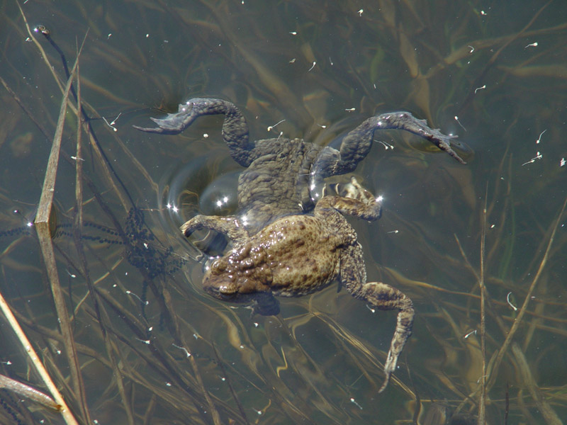 О, нашла. Только не говорите, какая гадость. Это лягушачья свадьба в набольшом озерке. Видны нитки черной икры и уже вылупившиеся маленькие черные головастики. Зеленая из того же озерка, но какой-то другой вид.