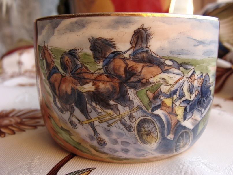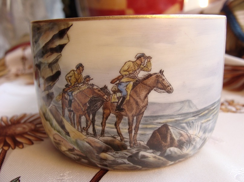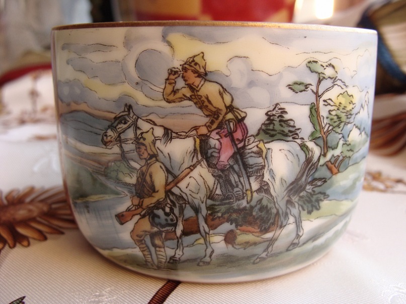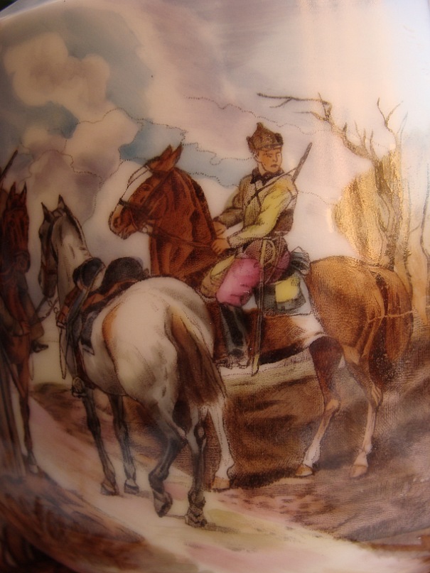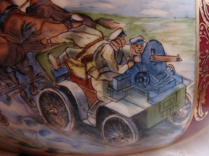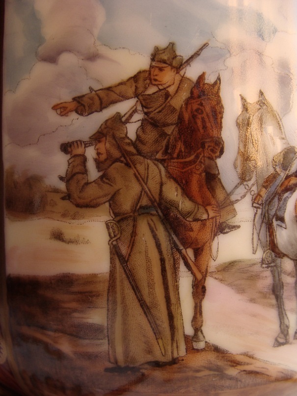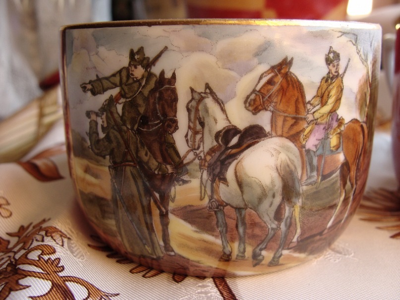 Murzavio, спасибо за такие подробные фото, изумительная роспись, просто иллюстрации к легенде о Чапае. Кому же в голову пришло их на сервиз положить? Действительно, чайку из них не попьешь, рука не поднимется...