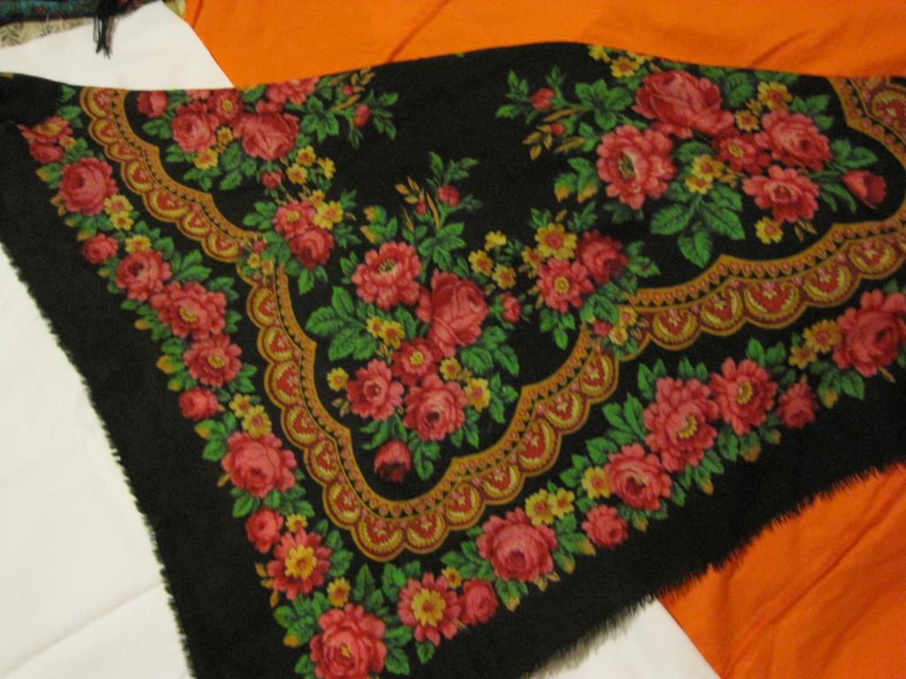 Там же: Небольшой шерстяной красочный платок. 70,5 х 71 см. На одном из зеленых листиков проставлено клеймо: "Павловский Посад, 1991".