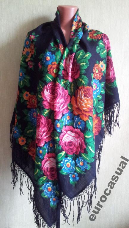 Павлопосадская шаль, чистошерстяной с шерстяной бахромой, основной фон платка черный с красными цветами, размер 146*146см, новый.
