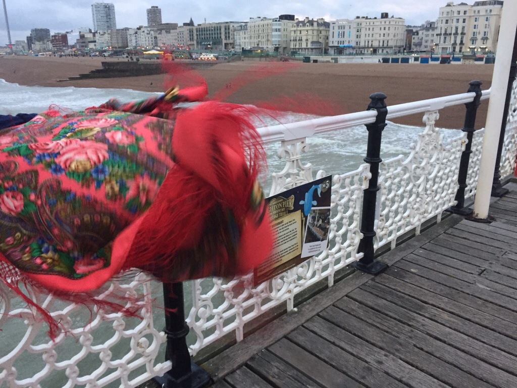 На знаменитом Брайтонском пирсе, игра с ветром поздно вечером.