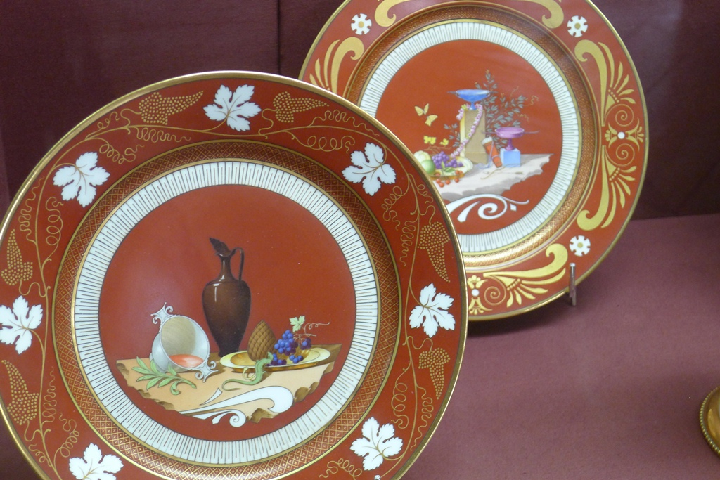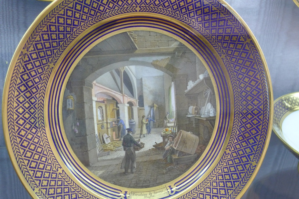 Ну и, само собой, увековечили в фарфоре родное предприятие. На тарелках - Севрская фарфоровая мануфактура, обжиг в муфельных печах, на 2-м фото - глазурование и еще какой-то процесс, перевести не удалось.
