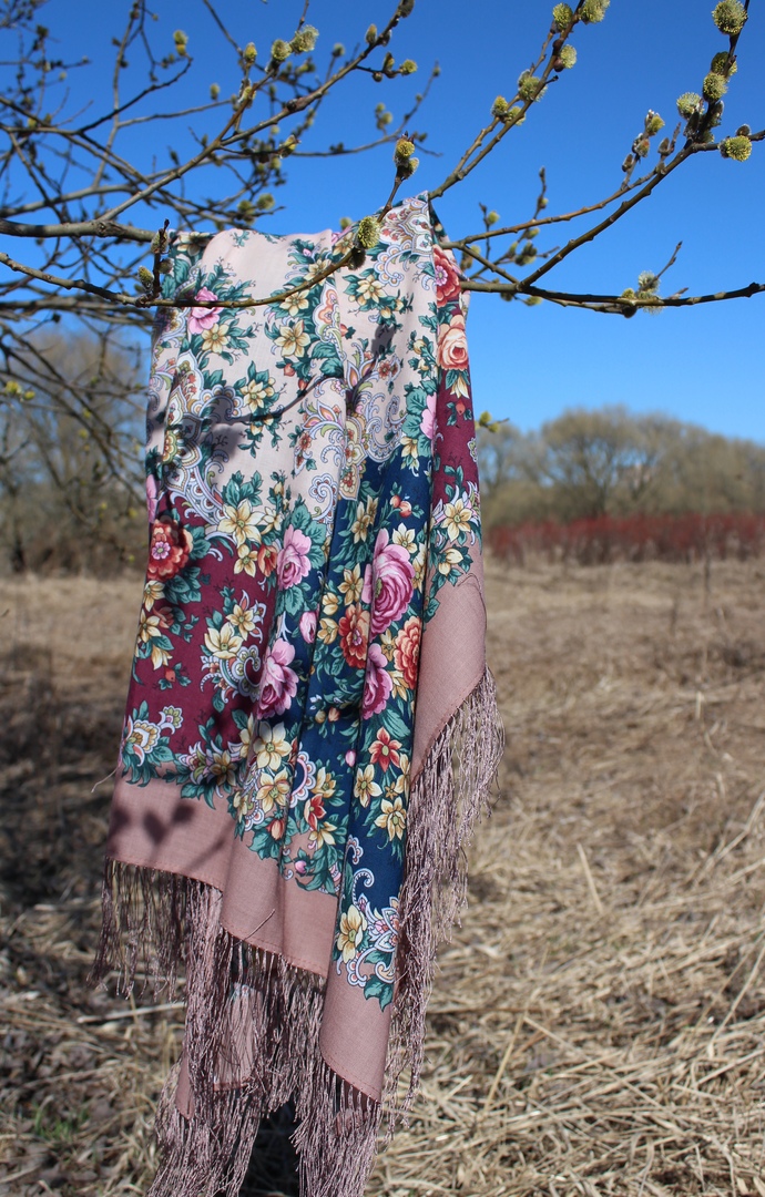 Девушки, я пока новичок на форуме, хотя давно читаю. Последние страницы во всех темах производят ошеломляющее впечатление - сочетание цветущей природы и чудесных платков, мастерство фотографов дают порой прямо эффект 4д кинотеатра, когда реально чувствуешь благоухание цветов, лёгкое головокружение и эффект присутствия. Весна! Хочу поддержать показ Ma-rusia моего любимого платочка 125 см Услада Ю. Уткиной и показать его другой колорит, считаю его недооценённым. А в нем такое нечастое сочетание цветов! Услада 1706-14