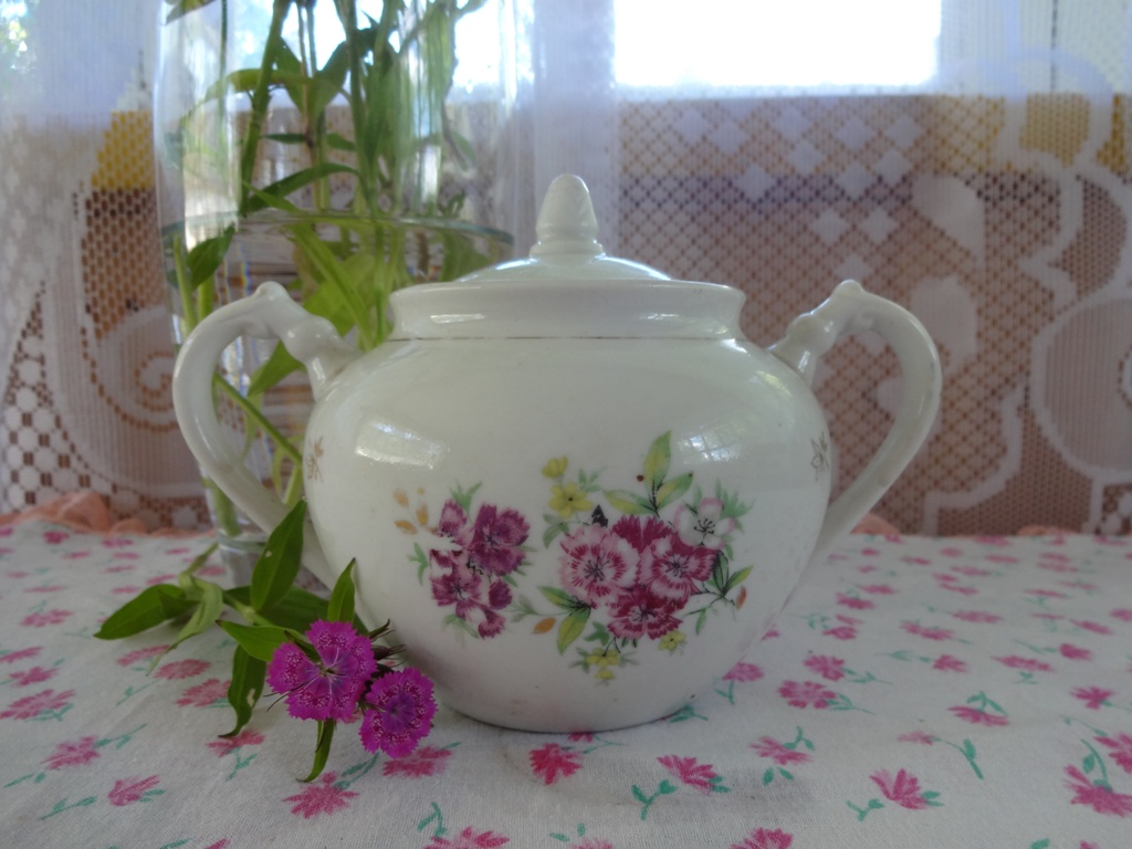 Разбирала на даче старые вещи и "нашла" сахарницу с редким, на мой взгляд, рисунком. Китайская гвоздика. Обычно розочки рисуют. Сахарница старая, на днище клеймо "Дулёво. 1958 год". Ещё в коробке была дулёвская чашечка с незабудками.