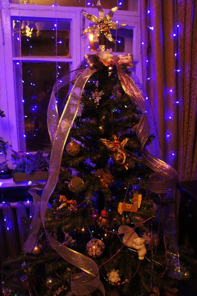 Покажу тоже ёлочку. Это ёлочка моей сестры, каждый НГ мы всей семьёй собираемся у неё дома. Игрушки на ёлочке разные: немецкое стекло, винтажные, а так же много сделанных моей сестрой, она сама делает очень красивые игрушки для ёлок и не только.