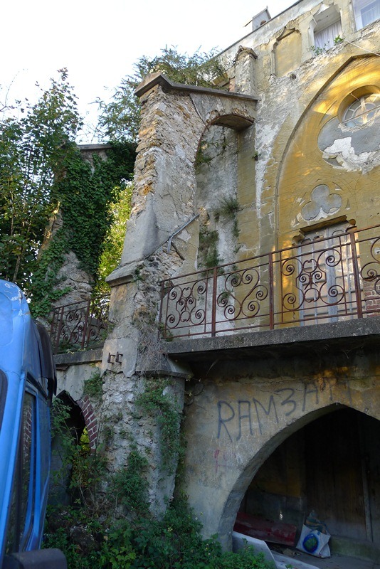 Возвращаемся, выходим из ворот, огибаем круглую привратную башню, идем снаружи вдоль стены. Башенки, и круглая, и квадратная, в неприглядном виде. Оконца выбиты либо заколочены, черепица крыш провалилась… Буйные заросли совсем поглотили и стену, и фронтон замка.