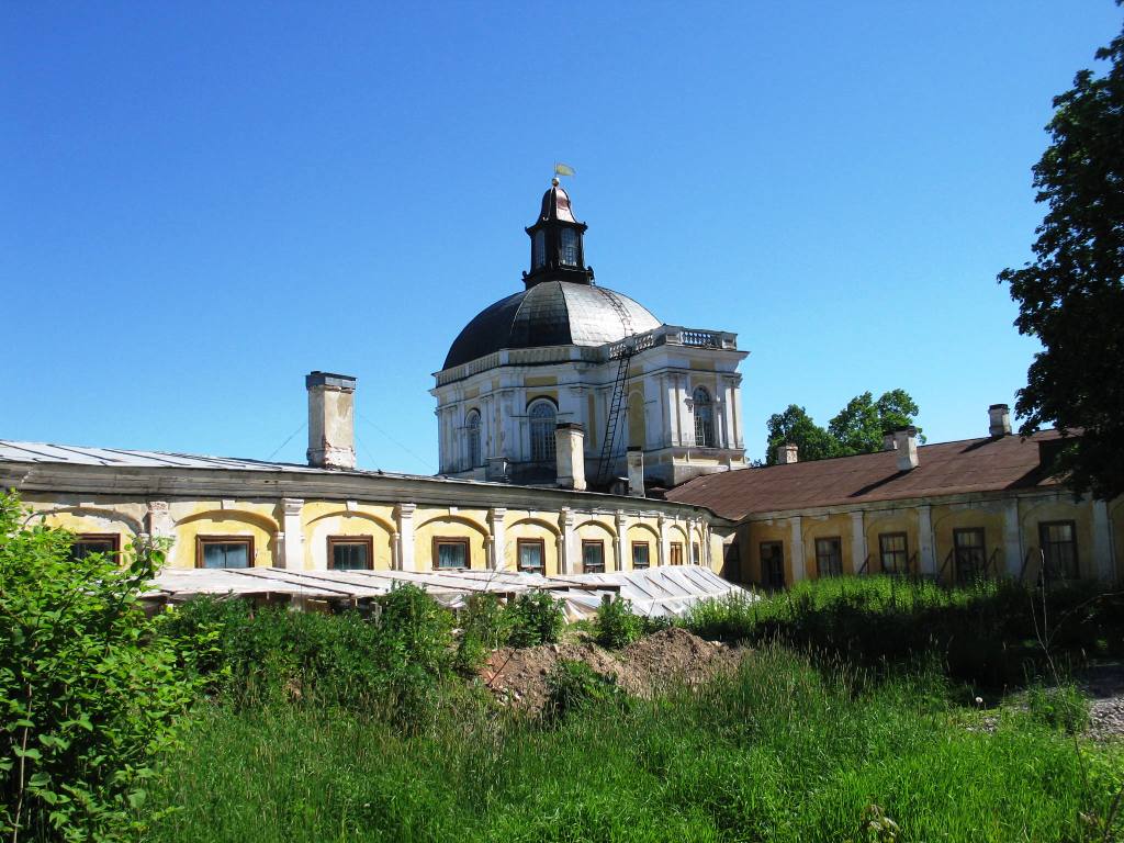 Любовалась я красотами Вьетнама (большое спасибо Mme N!). И вдруг мне вспомнились другие вазы. Если не против, покажу свои фото из Ломоносова. Была я там в начале июня 2007 года. Давно туда тянуло, этот пригород Питера не так раскручен, как Павловск, Пушкин, и блистательный Петергоф. Хотя от него совсем рядом. Ломоносову (Ораниенбауму) во время войны повезло. Немцев там не было. Но бои шли страшные. Дворцово-парковый ансамбль, конечно, пострадал, но несравнимо меньше, чем остальные. Дворец Меншикова занимали всевозможные организации, и гражданские, и военные. После войны все силы бросили на восстановление разрушенных дворцов и парков, а Ломоносов оставался без денег. Сейчас, похоже, и до него дошли руки. Планы у властей грандиозные, но я увидела, похоже, только начало их претворения в жизнь.Это вид со двора. Подойти с главного входа было невозможно - вовсю шли реставрационные работы. Поэтому экскурсии пускали с этой, непарадной стороны. Самая сохранившаяся экспозиция размещалась в этом восьмиугольном угловом помещении под куполом. Там собрана большая коллекция произведений восточного искусства.Здесь и китайский, и японский фарфор. Во время войны часть ваз закопали в землю, часть не успели, их наполняли водой, чтобы при бомбёжках не лопнули. Удалось сохранить бОльшую часть коллекции.