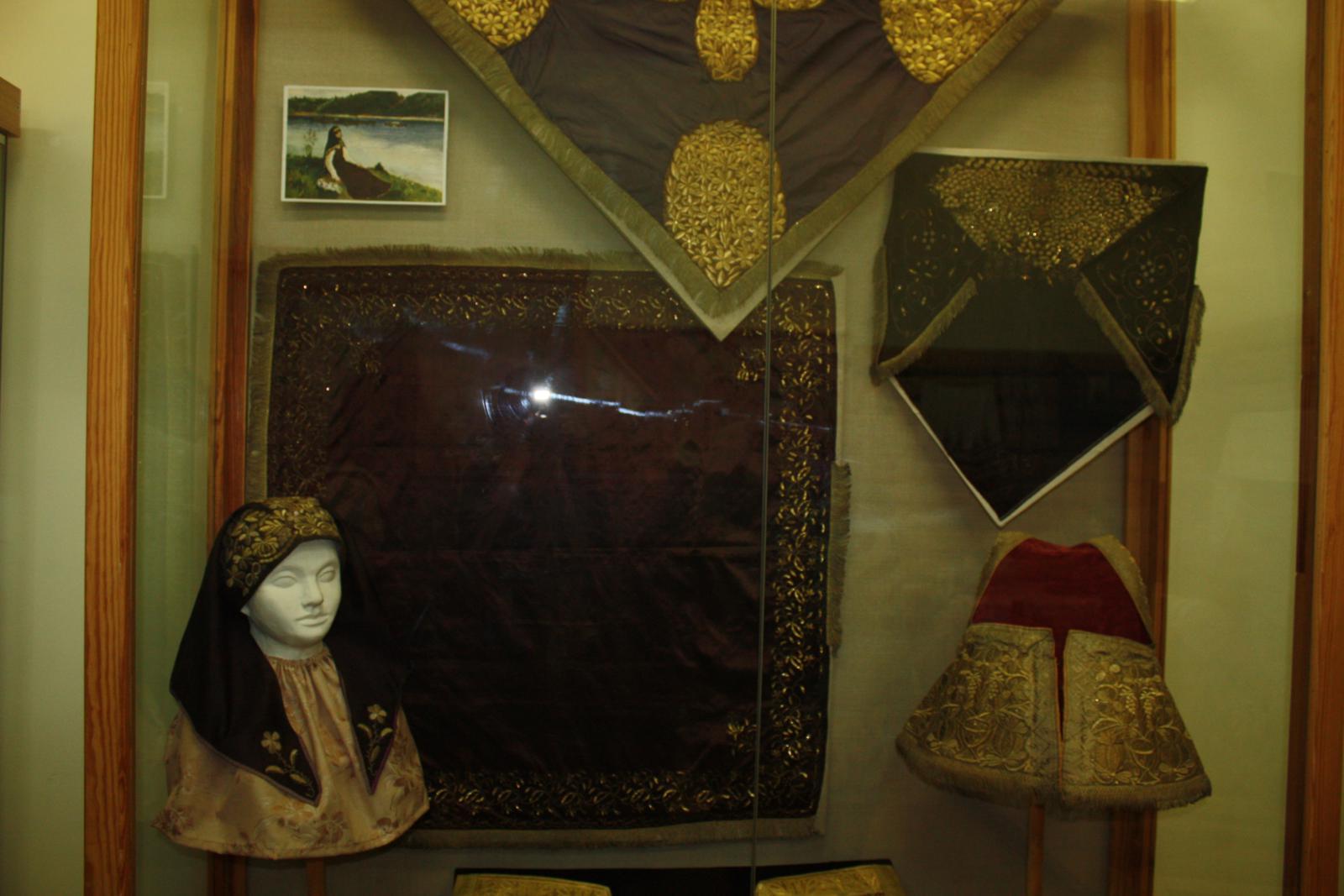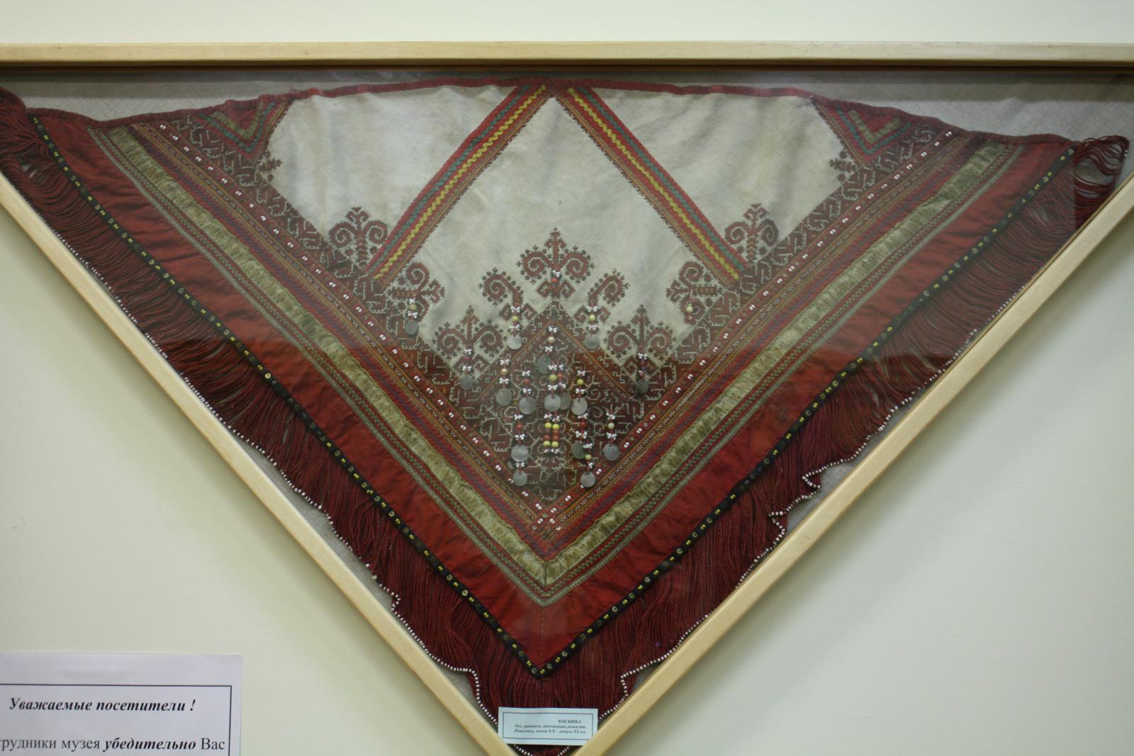 По периметру зала в витринах за стеклом находится основная экспозиция Музея платка и шали: