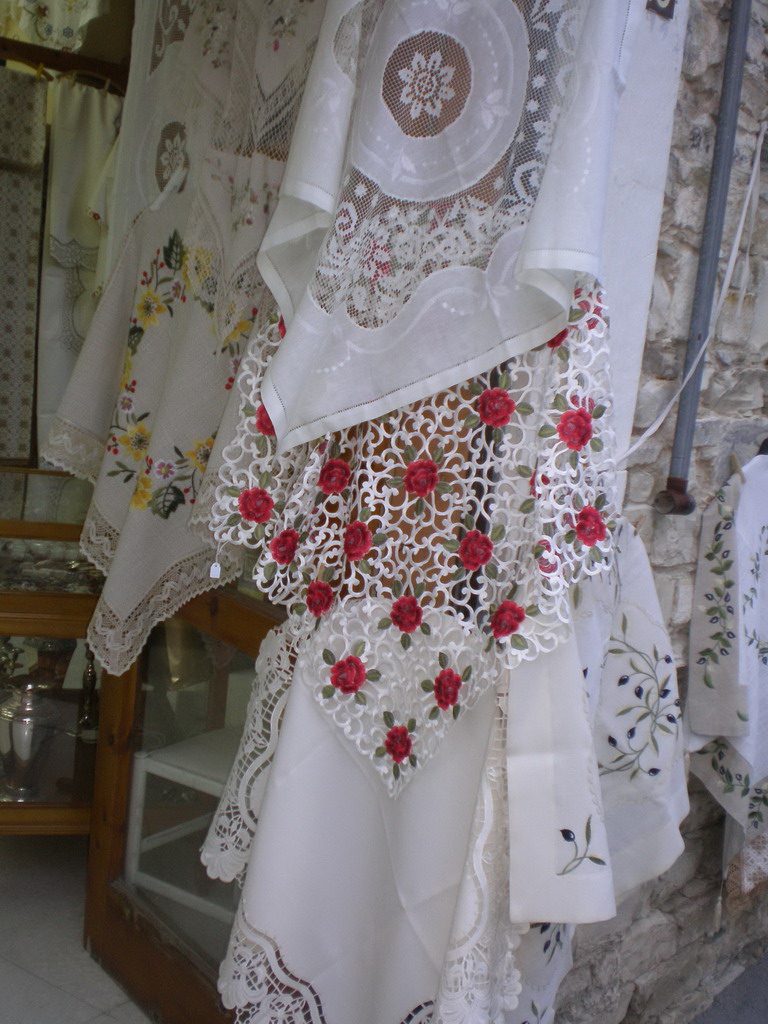 Софико , такие зонтики летом видела несколько раз на улице,они носят их защищаясь от солнца ,а мне кажется что такой зонтик и платья требует соответствующего и наверное шляпки. Алла,цены они не пишут на товарах.Я спросила пару раз кофточка(очень красивая) связанная крючком стоила 50 евро ,а салфеточка среднего размера связанная (сплетенная) на коклюшках 6 евро. Серебро очень понравилось, браслеты серьги ажурные очень красивые ,но муж торопил не дал сфотографировать . Надеюсь поехать туда с подругой ,тогда мы уже сфотографируем все что понравится. ;)