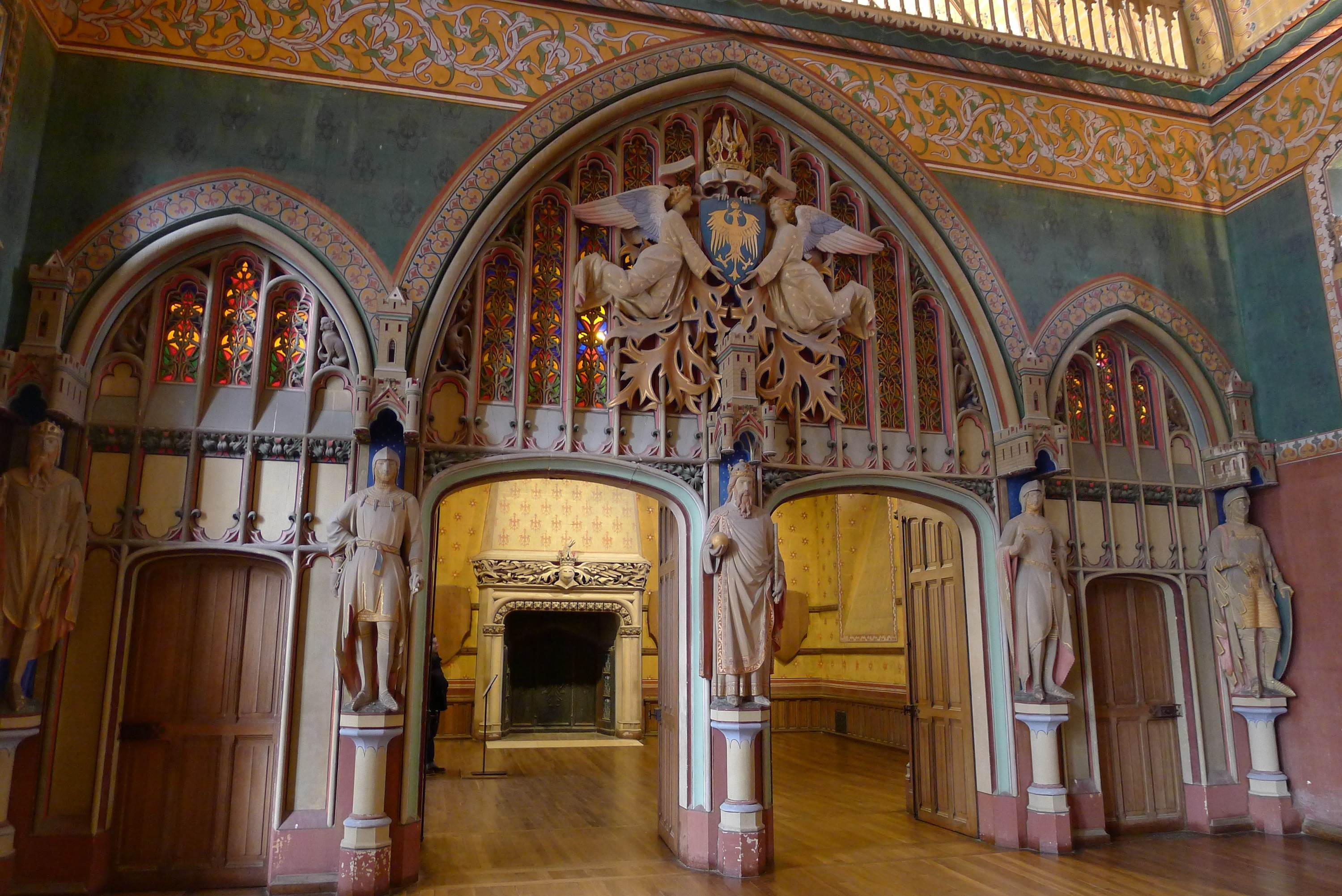 Вначале предполагалось отстроить лишь несколько башен с жилыми помещениями, сохранив живописные руины. Но в 1861 г. проект изменили – теперь уже архитектор планировал полное восстановление резиденции, работы оценивались в 5 млн. франков. В 1879 г. После смерти Виоле-ле-Дюка в 1879 г. его дело продолжил его зять и ученик Ураду. В 1885 г. из-за отсутствия средств реконструкцию остановили, и внутреннее оформление замка не было закончено.