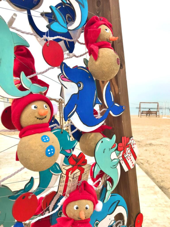 И вообще, на Центральном пляже - много всяких праздничных локаций: елки с авторскими игрушками, качели, гигантская «табличка» на море. И бутылки, куда же без них. Но заботливые люди добавили к ним мандаринок. Для создания, так сказать, новогоднего настроения.