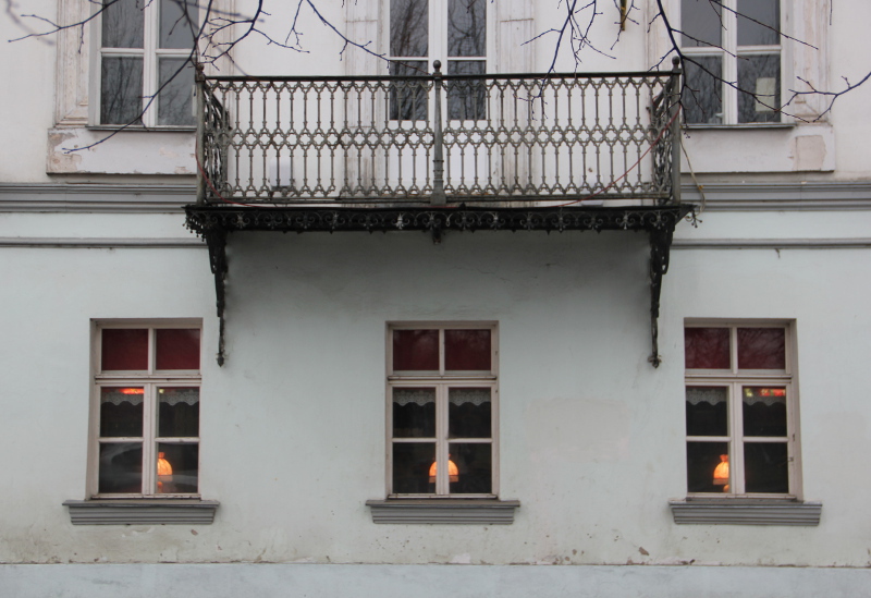 В одном из домов на первом этаже работает ресторан, в окнах которого уютно светятся настольные абажуры.