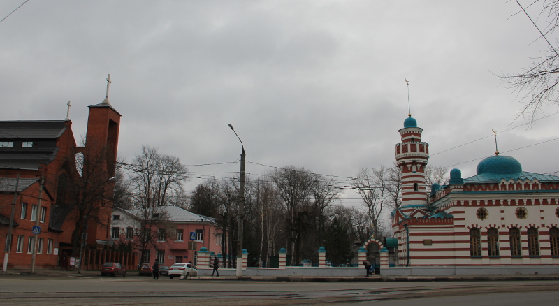 В Твери есть место, где по соседству на одной площади стоят лютеранская церковь, которую совсем недавно построили, и мусульманская мечеть, которой более ста лет и построена она по проекту 1844 года в новомавританском стиле.