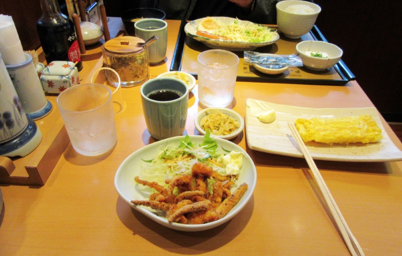 На следующий день я сет брать не стала, выбрала из меню отдельные блюда на свой вкус. Совсем другое дело! Вкуснейший омлетик, который они делают слоёным на прямоугольной сковороде, очень люблю его :Q, жареный кальмар и просто шинкованная капуста. Вот такая капуста тонкой нарезки не менее популярна, чем дайкон (если не более). К омлету плюхнули майонез, на уголок тарелки. Это было уже вполне съедобно!