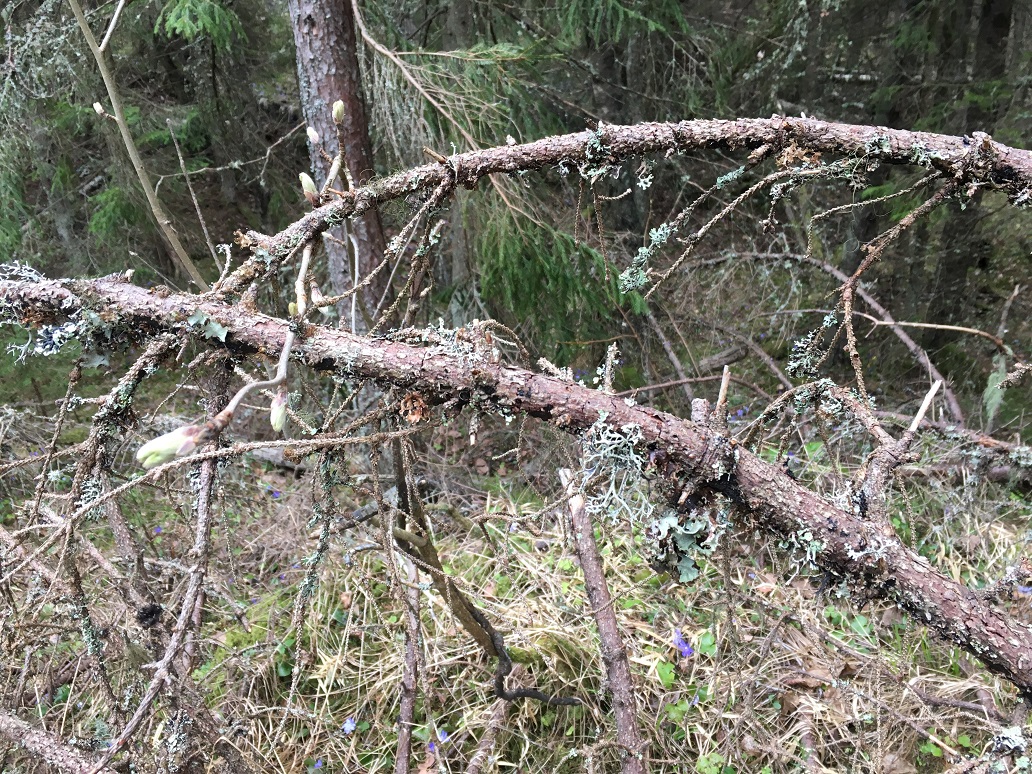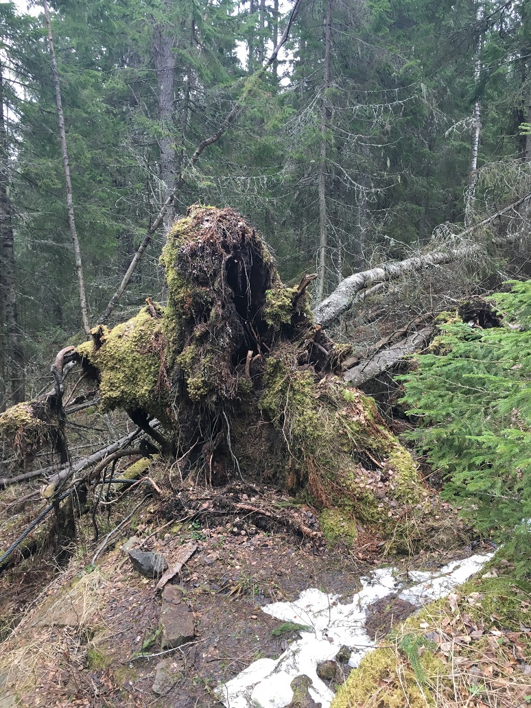 На Валааме у деревьев корневая система находится очень близко к поверхности, она не выдерживает ветров, поэтому встречаются вырванные с корнем