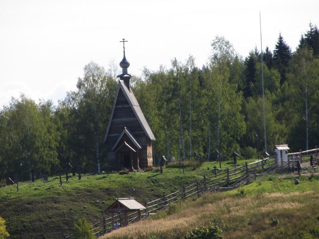 Недалеко от деревянной Воскресенской церкви стоит памятник (на фото едва различим, почти у кромки снимка, справа) - скульптура Художника. Левитана, конечно.