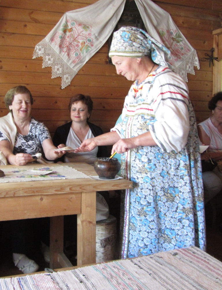 Гостей пригласила сесть на лавки и начала рассказывать свои удивительно-интересные истории о всех предметах и вещах, что находятся в доме: