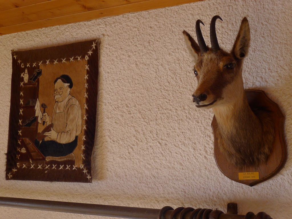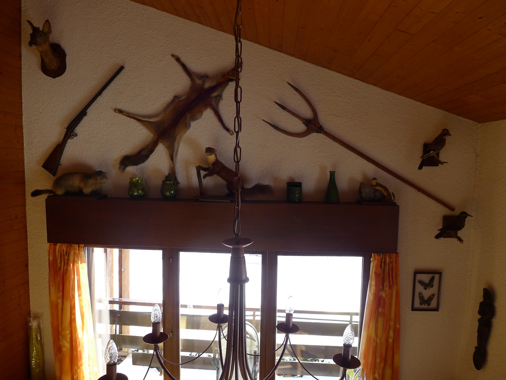 Повсюду чучела зверей и птиц, добытых в окрестностях (судя по латунным табличкам – «Ля Клюза, сентябрь 1986», «Ла Бальм, октябрь 1990»), на стенах, полу, сундуках разные шкуры. Определенно здесь не хватает «зеленых» :!! .