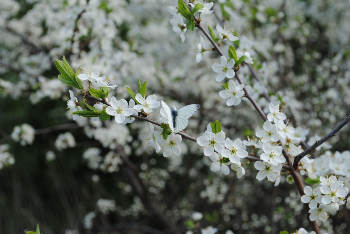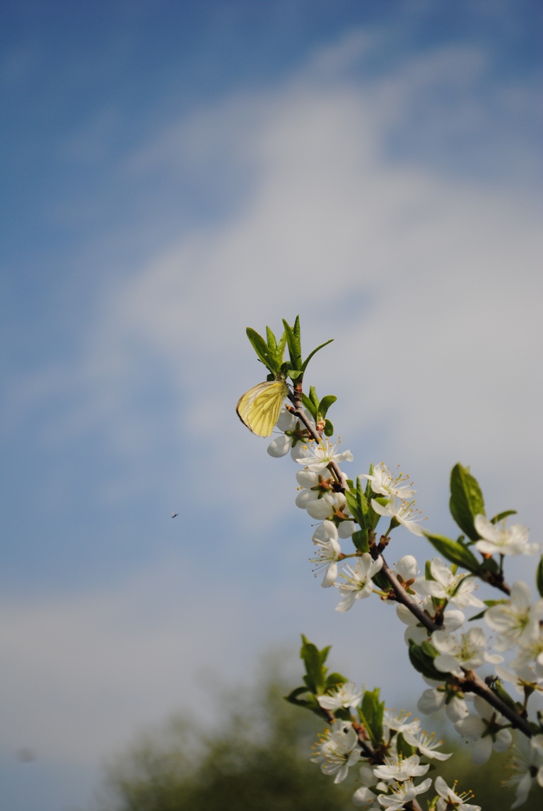 Бабочка с бело-голубыми крылышками и терн.
