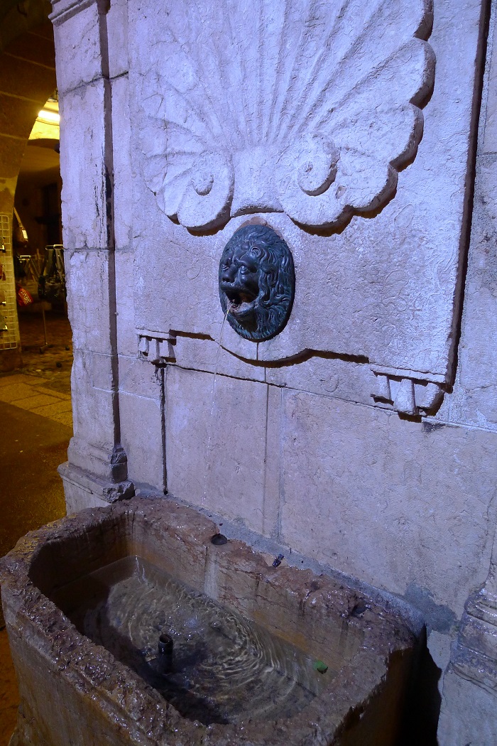 Здесь же на площади у пролета аркады стекает в каменную чашу струйка фонтана Кибере, в путеводителях его датируют 1635 годом, но на стене рядом с рельефным изображением символа города – форели выбито «1646» - ?