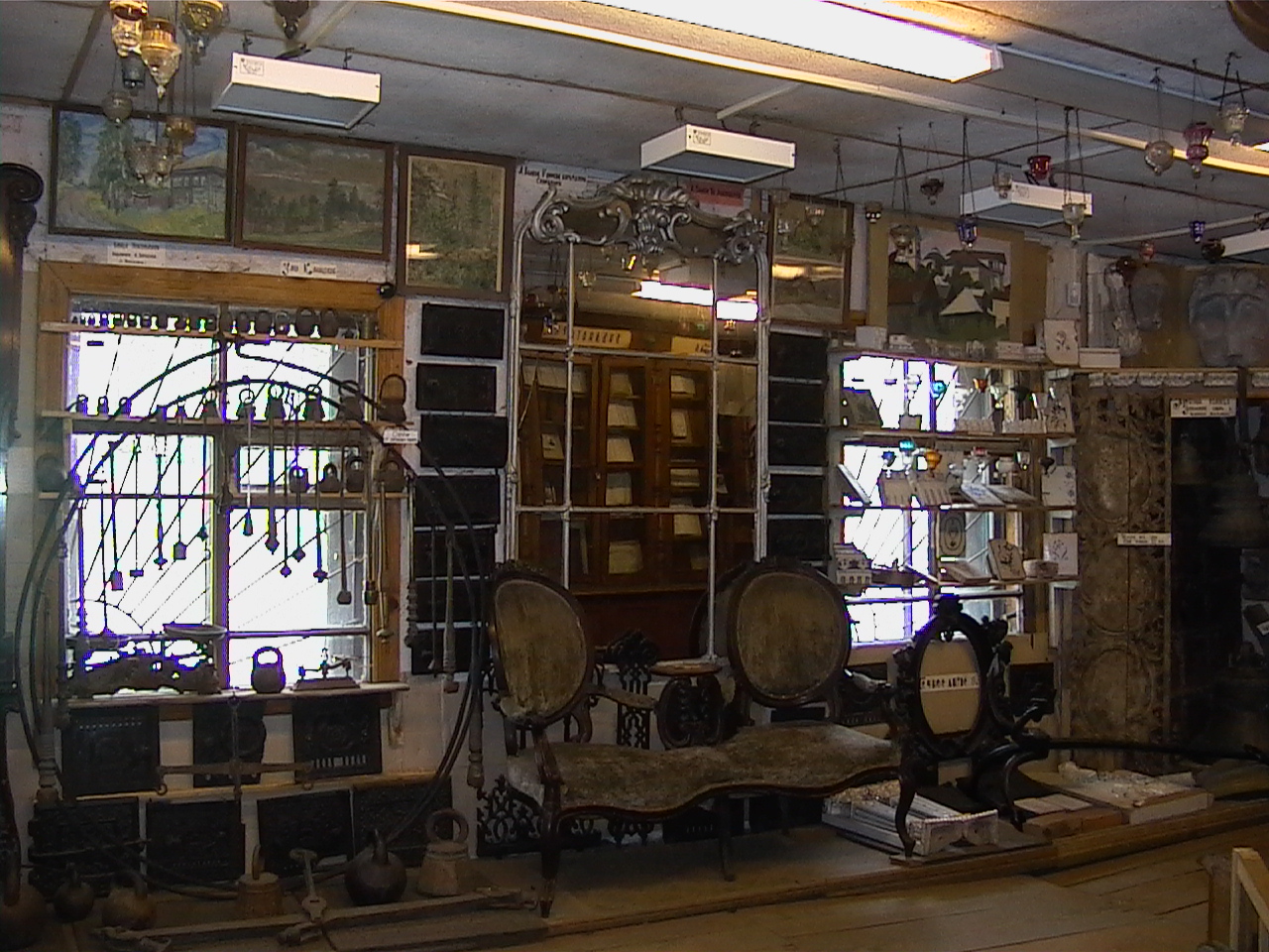Вот какие сведения о Мышкине мы почерпнули из рассказа. Когда Екатерина II дала ему статус города, то в нем было 183 жителя. В середине 19 века на 2000 населения приходилось 147 купцов, а сколько сейчас купцов из 6500, нам в музее сказать не смогли. Еще нам показали интересный экспонат – железные галоши. Оказывается, когда в 20-х годах 20 века Голландия перестала поставлять нам резину, народ стал делать галоши для валенок из железа, а подошву из дерева, во чудеса, такого я еще нигде не видела. Так что мы в любом случае прорвемся, плевать нам на Голландию и Ко.