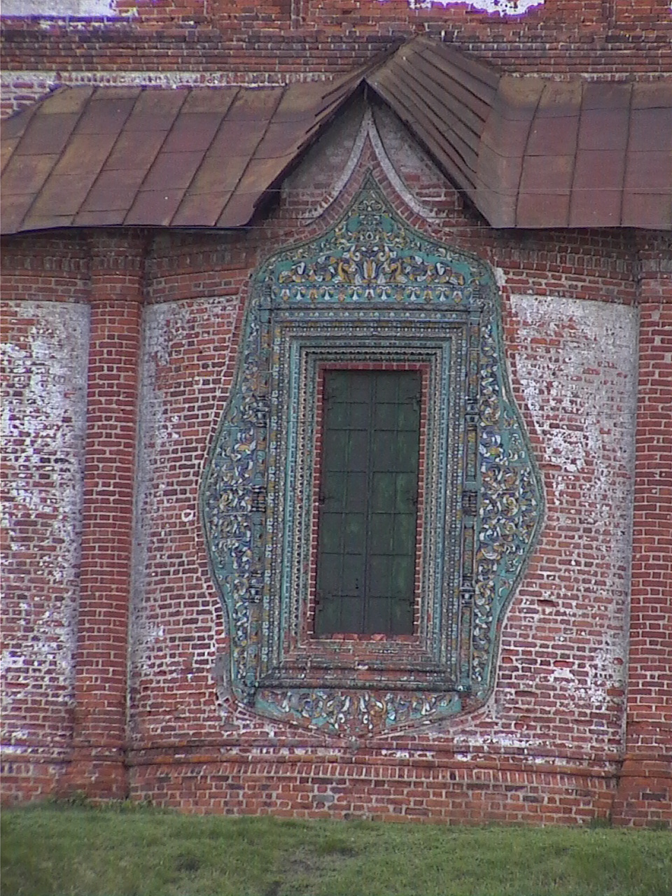 и принялись искать «Блинную», в которую я заходила каждый раз во время проезда через Ярославль во время учебных экскурсий в 1986 году, исходили все расходящиеся от театра улицы-лучи, но не нашли ничего подобного, видно я все перезабыла или местность изменилась. Тогда заглянули в другое кафе, где тоже вкусно поели (220 руб. на двоих). Времени у нас было еще много, Матиз пребывал на охраняемой стоянке, Вова за него не волновался, и мы пошли через мост на ту сторону Которосли, чтобы попасть к ее устью, где стоят две красивые церкви 17 века, надо было их рассмотреть поподробнее. Шли мы долго-долго, видели и какие-то полуразрушенные лачуги и рядом возводящиеся настоящие дворцы, но в конце концов оказались возле церквей. Обе они красного кирпича и украшены совершенно потрясающими изразцами, даже, на мой взгляд, лучше, чем знаменитая Успенская церковь на площади перед Спасским монастырем. Просто целые панно сделаны из изразцов. Кстати, берег Волги тут не обустроен, имеет обычный дико-пляжный вид. Вова сидел, смотрел на реку, а я со всех сторон обходила церкви (кстати, оказавшиеся действующими и старообрядческими), ища наилучшую точку для фотосъемки. Это было не так-то легко, т.к. то провода мешают, то забор, то солнце не с той стороны, то оно зайдет за тучку, но я все-таки сделала пару приемлемых кадров. Потом мы вернулись, уже другим путем, через Закоторосльский район (и не выговоришь). В половине шестого поехали в обратный путь.