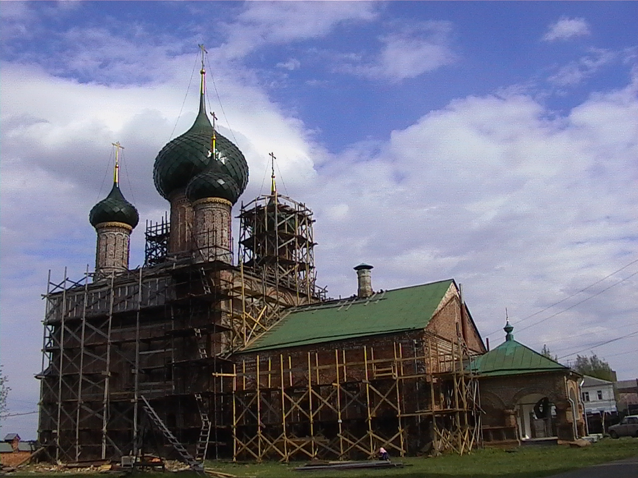 Со всеми заморочками в Рыбинск прибыли в 11.45. К этому времени слегка успела испортиться погода, безоблачное небо затянулось тучами. Рыбинск встретил нас огромным количеством знаков «Туда ехать нельзя», «Останавливаться запрещено», но мы все же нашли местечко для Матиза, и, оказалось, рядом с главной улицей. Теперь она называется Крестовая, а раньше была проспект Ленина. Вообще все в центре или ремонтируется, например, с Крестовой снят асфальт, а многие дома обшарпанные и разваленные, или только что покрашенные, где уже мелкие капиталистики завели свои лавочки. Застройка двухэтажная, редко трехэтажная. Гигантский Спасо-Преображенский собор тоже весь в лесах и развале, но вроде его чинят.