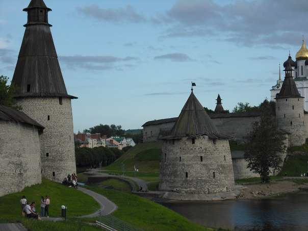 Кремль или Кром(от слова окормлять,то есть защищать) расположен на мысу при слиянии двух рек-Псковы (маленькой) и Великой (большой)В 8-10 веках строятся деревянные стены Кремля,в 10-13 веках строятся каменные укрепления,после чего начинаестя строительство башен Кремля,усиление крепостых стен и наращивание их в высоту.В Кремле собиралось народное вече,хранилось продовольствие,стояли клети,которые охраняли сторожевые собаки,их называли "кромскими псами".На территории Кремля находится Троицкий собор-главный храм Псковской земли и Пскова.