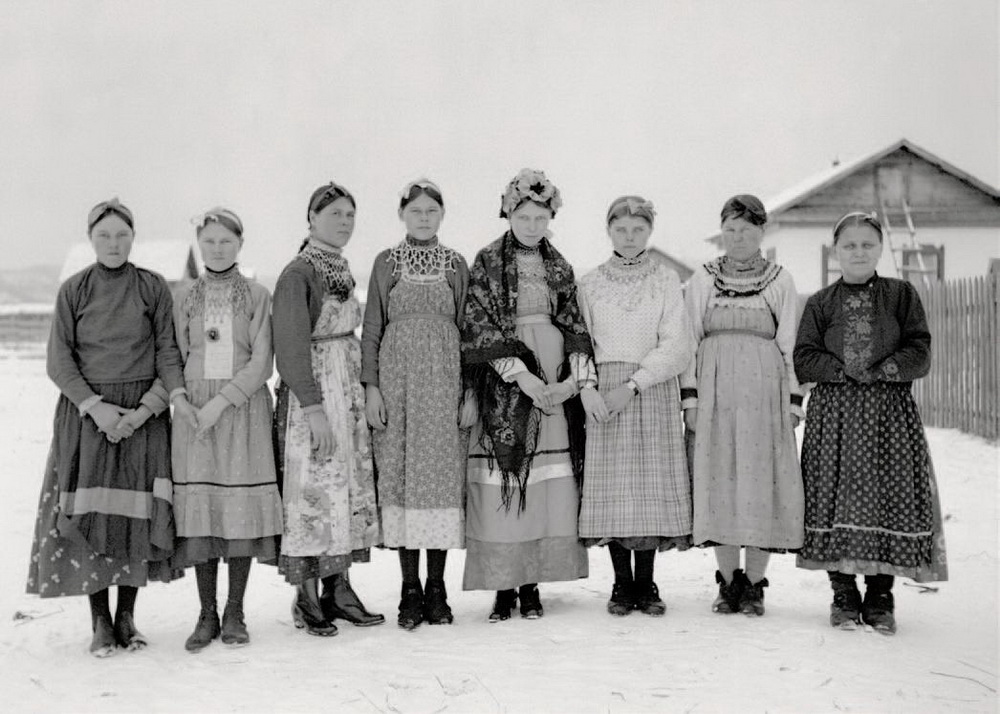 Очень старое фото (с просторов интернета)...."Типы раскольниц-поморок. Семеновский уезд 1897, это инф. с источника (можно посмотреть по ссылке гугла, много интересных старых фото). На девушке в центре похоже что ПП платок?. Фото, где девушки это Манчжурия, 30-е годы.
