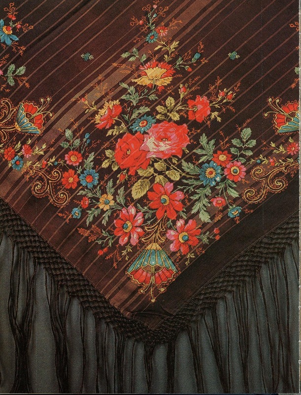И еще из той же книги "Шаль, Московская губерния.Павловский посад, вторая половина 19 века. Шерстяная с шелковыми полосами, узор набивной, кисти шерстяные".