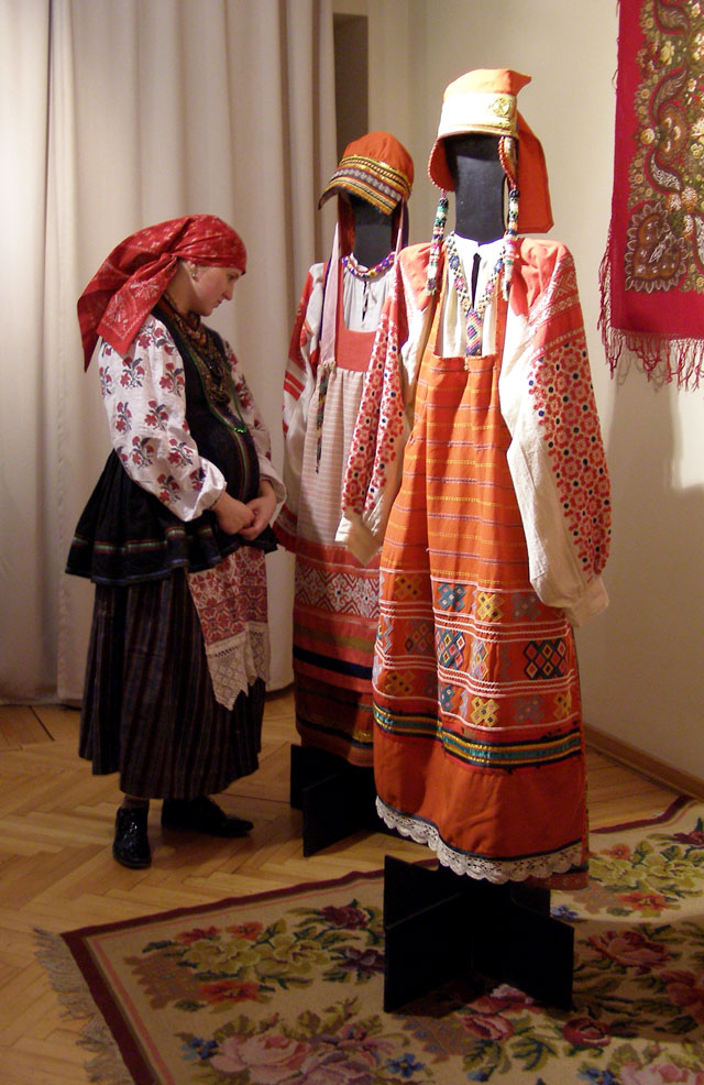 Вчера открылась выставка выпускников художественно-промышленного училища. Я сделала два фото, на которых виднеются края двух шалей Татьяны Сухаревской. На их фоне стоят участники фольклорного коллектива в подлинных костюмах южных районов России.