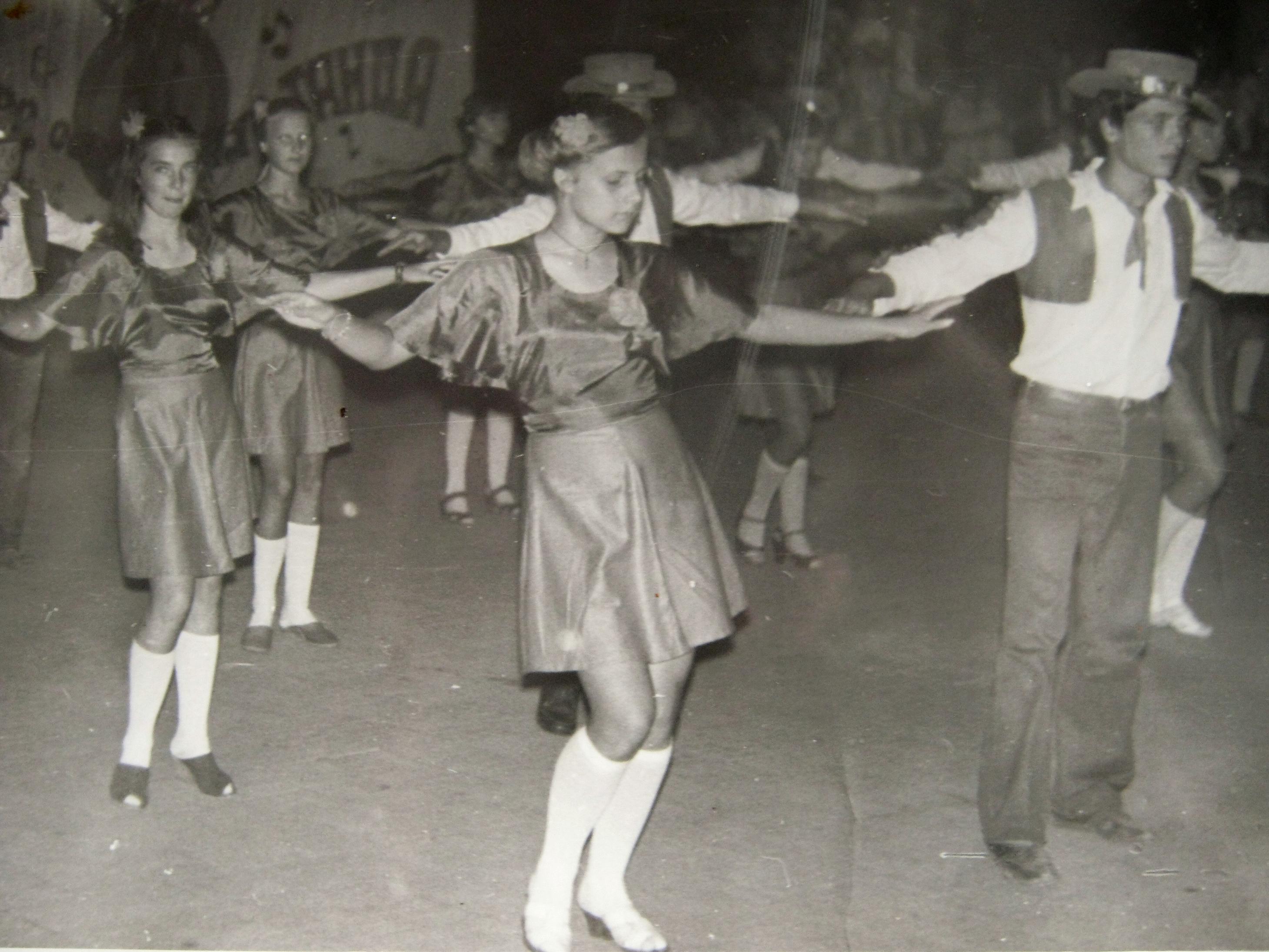 1982г. Конкурс бальных танцев (юбка и цветы - красные, прозрачный блузон - зелёный. Мне 13 лет.