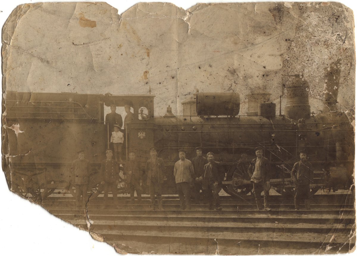 Старинная фотография: мой прадед привел своего младшего сына Борьку, моего деда, смотреть паровоз.
