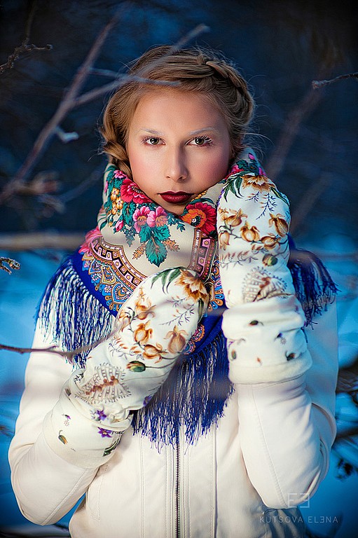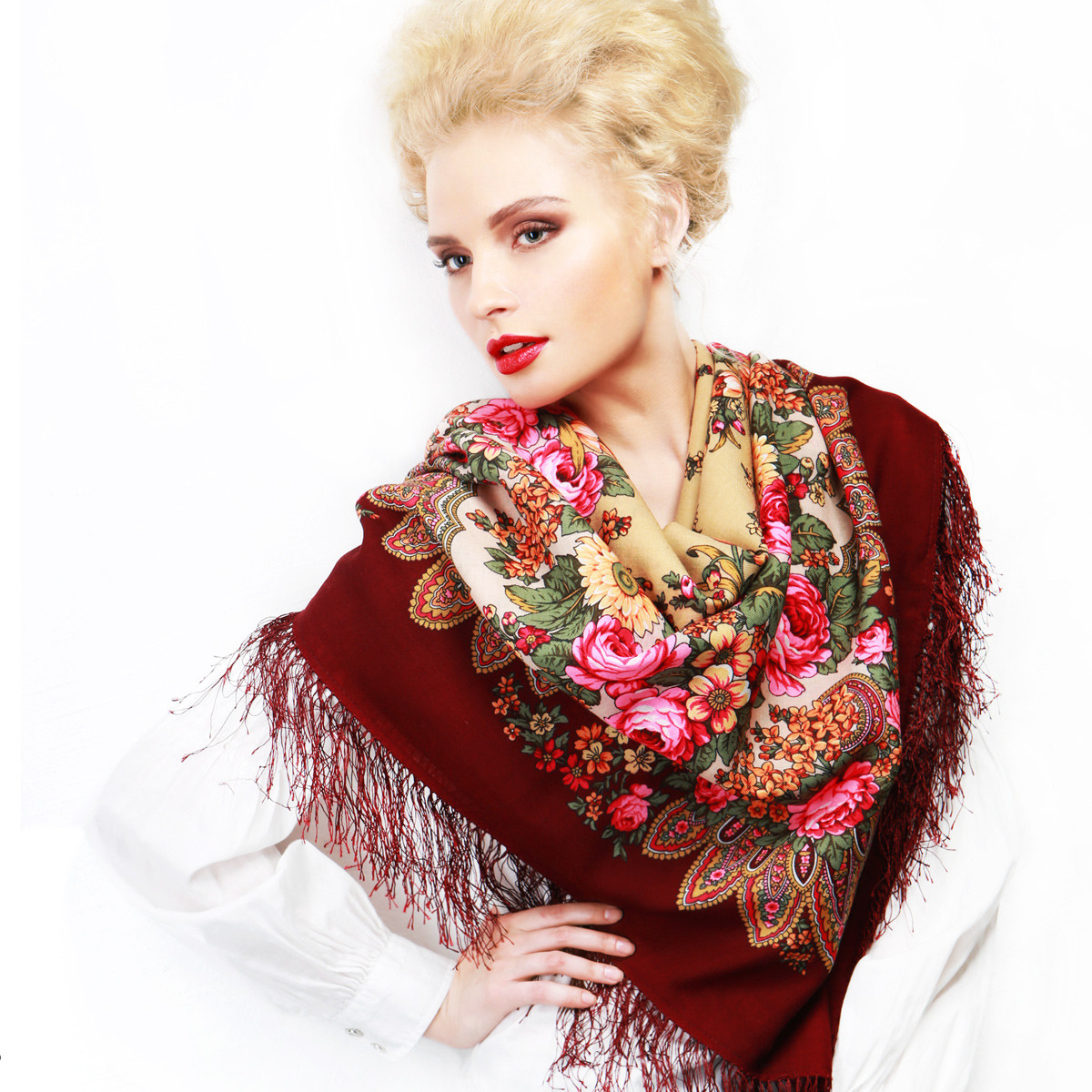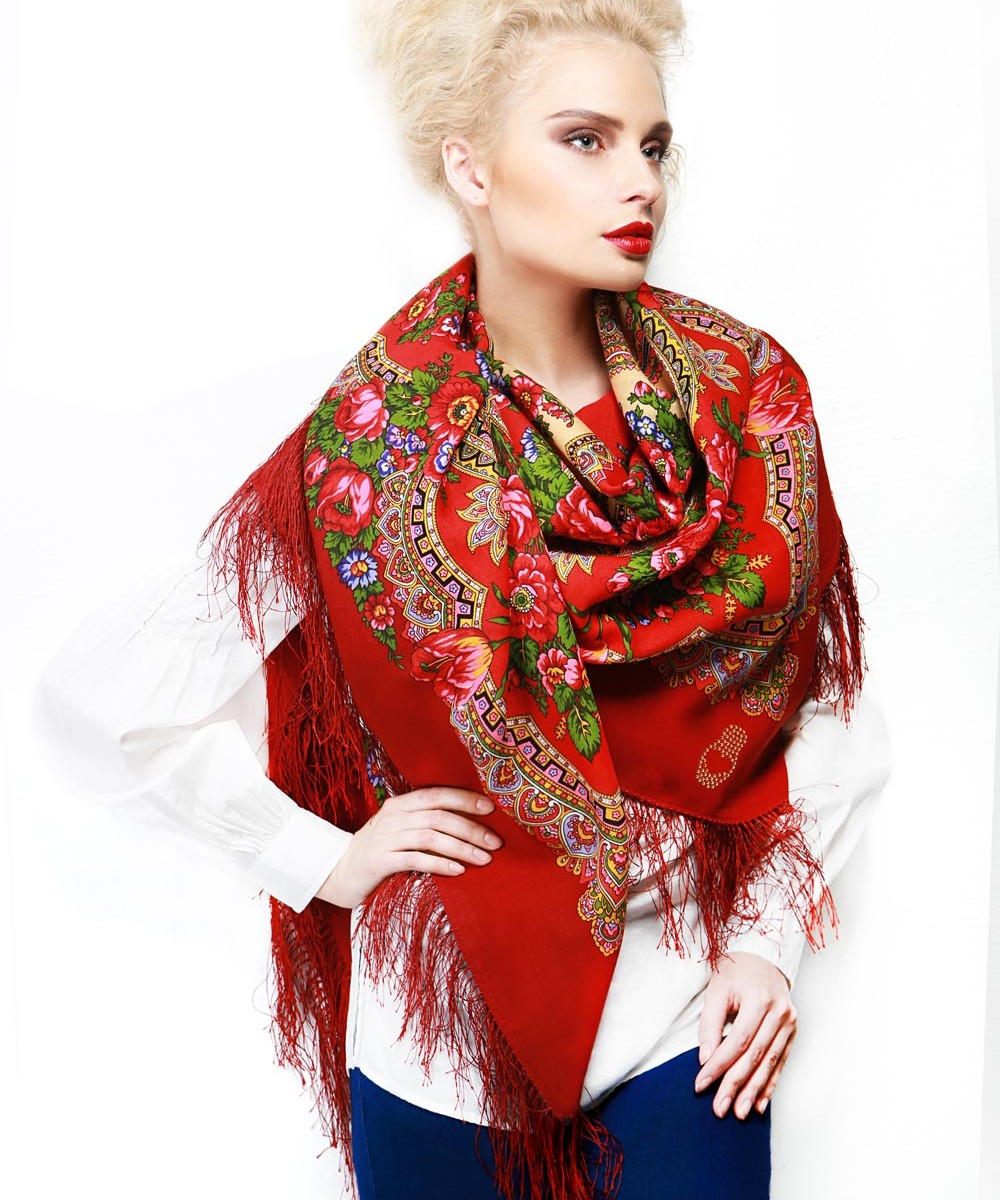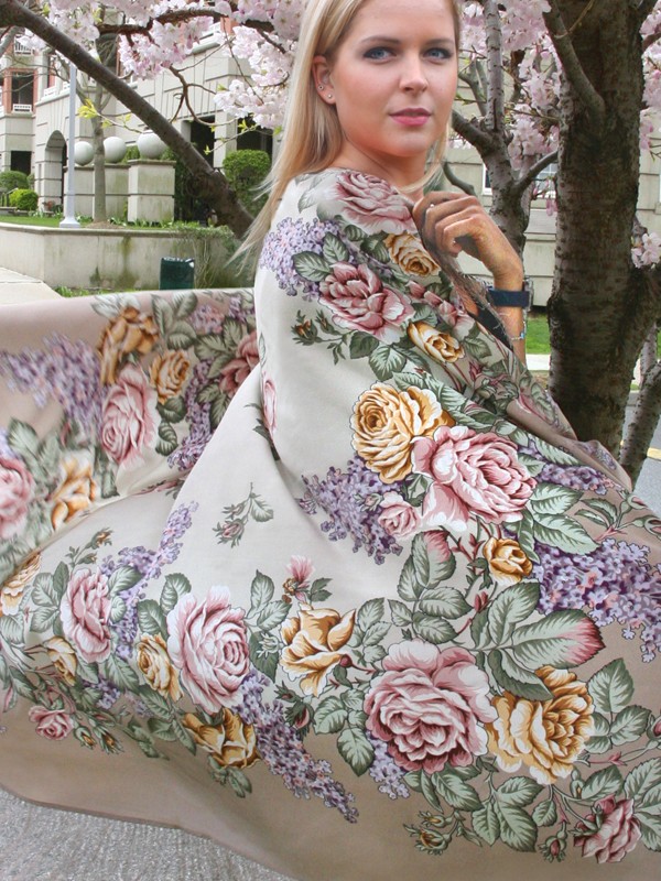 Невероятно нежная модель, выполненная по мотивам традиционных узоров. На белом фоне красиво разбросаны букеты из синих и красных роз в сочетании с веточками зелени. Растительный орнамент стремится к центру платка, превращаясь в изящные узоры. Динамичность картины навевает мысли о пробуждении природы. По периметру павлопосадский платок украшен шёлковой бахромой. Автор рисунка, Ирина Дадонова, сумело совместить классические элементы русских аксессуаров с модными в нынешнем сезоне оттенками.
