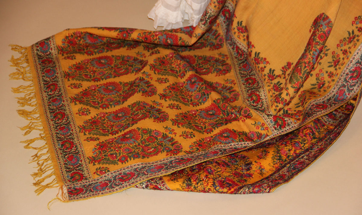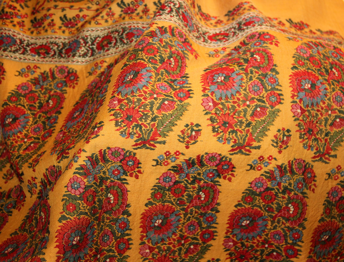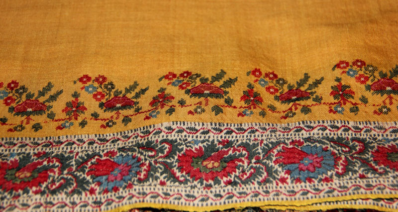 И ещё жёлтая кашмирская шаль - теперь это не квадрат, а прямоугольник. На ощупь шерсть очень колючая и плотная. Да ещё ткачество придаёт плотности в местах с орнаментом.