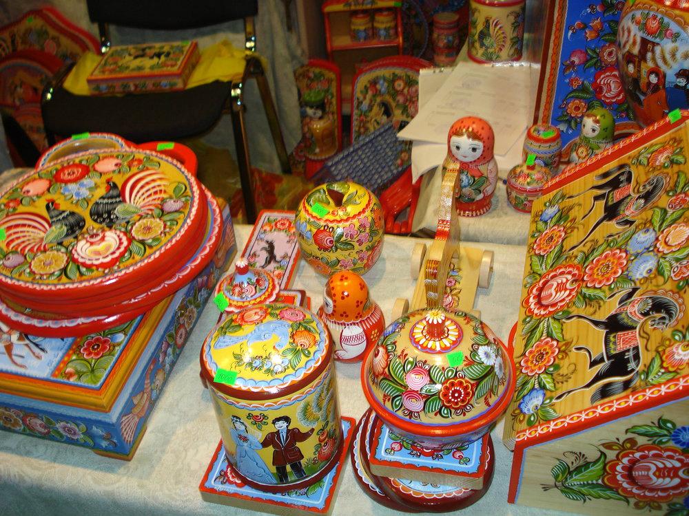 Самое интересное очень быстро раскупают, в первый же день. Очень нравятся работы Наташи Жуковой из Сергиев-Посада. Это старая деревянная утварь великолепно расписанная