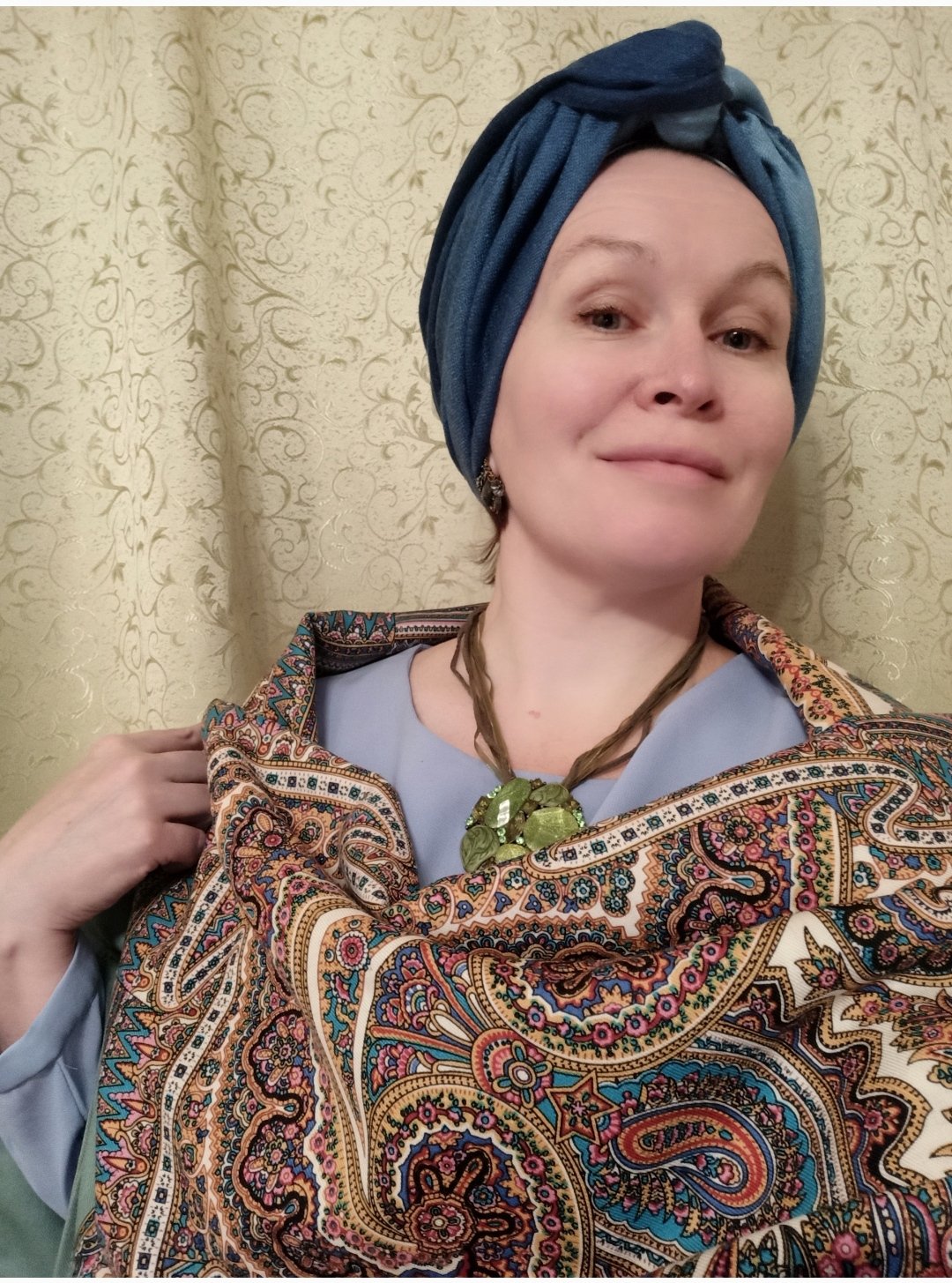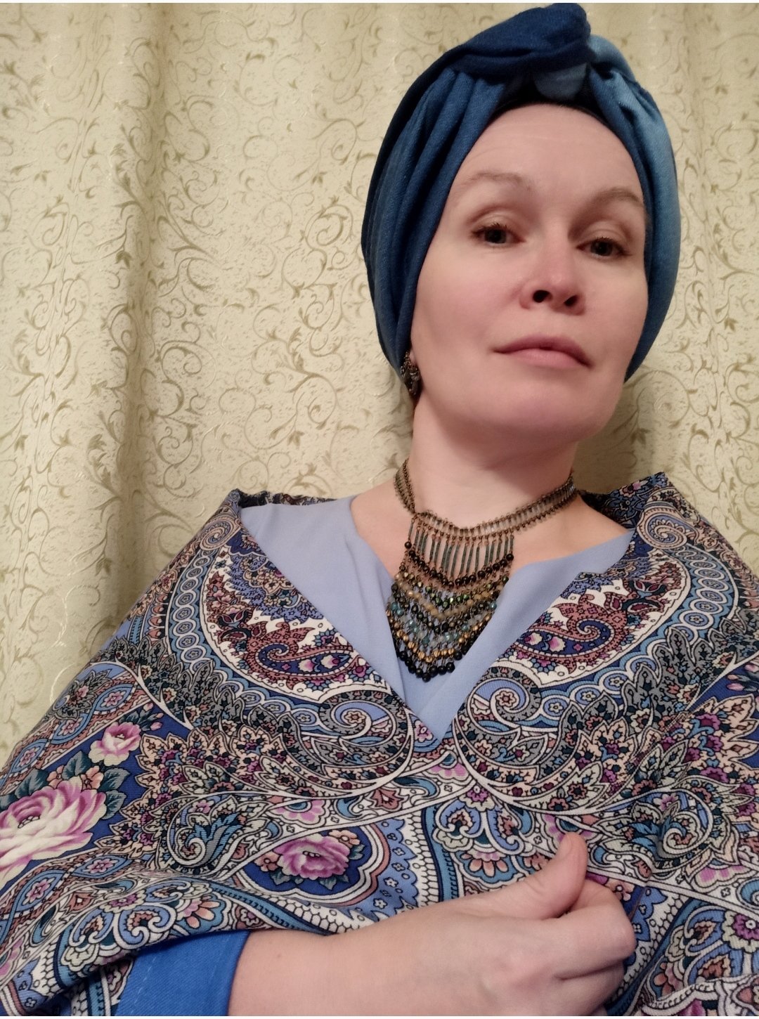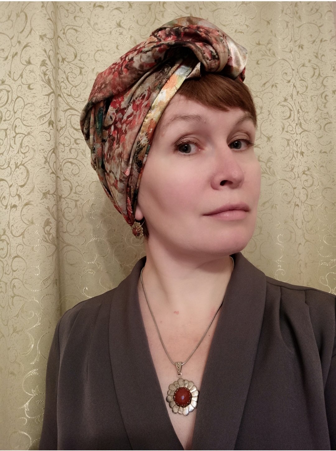 2. Держатся на голове всяческие конструкции по-разному - шерсть обычно без проблем, шёлк иногда просто можно пришпилить тонкой булавкой в 1-2 местах. Хлопок лучше всего, не сползает, подоткнул краешек и готово.