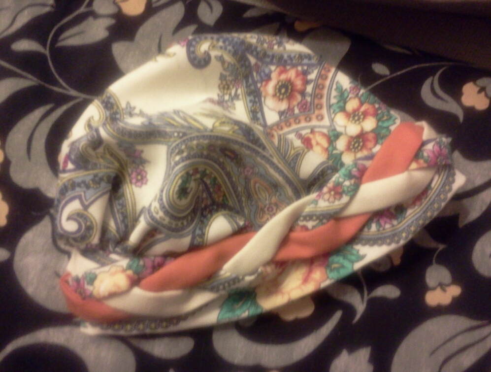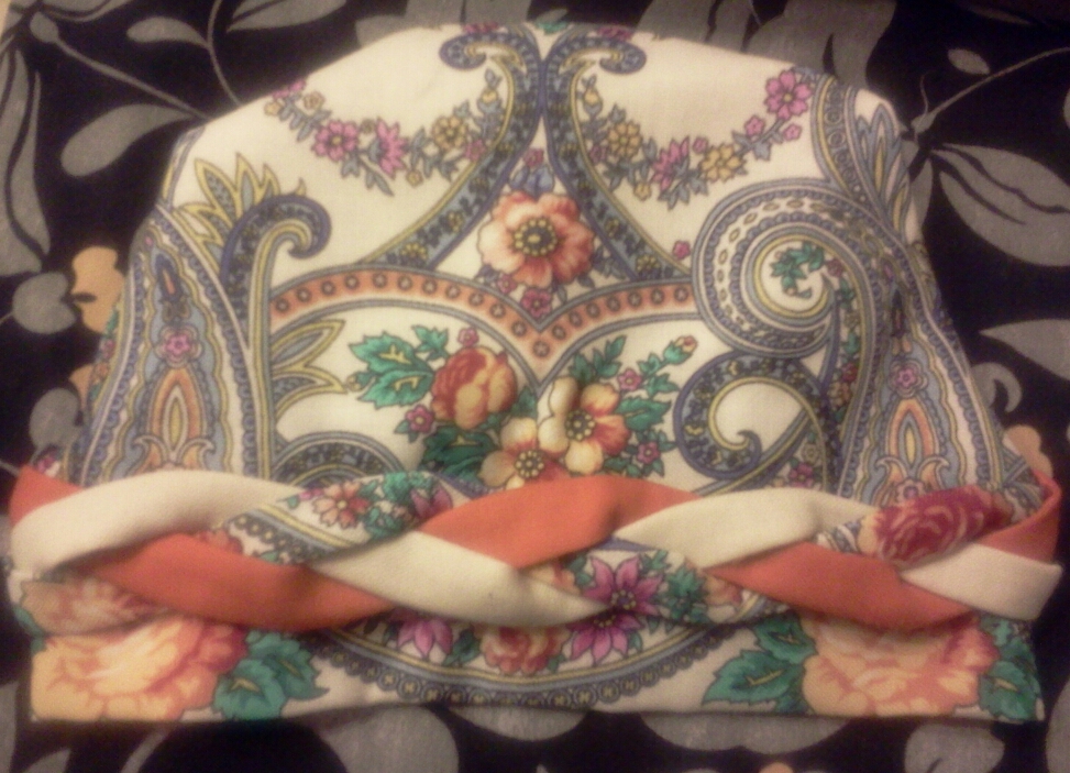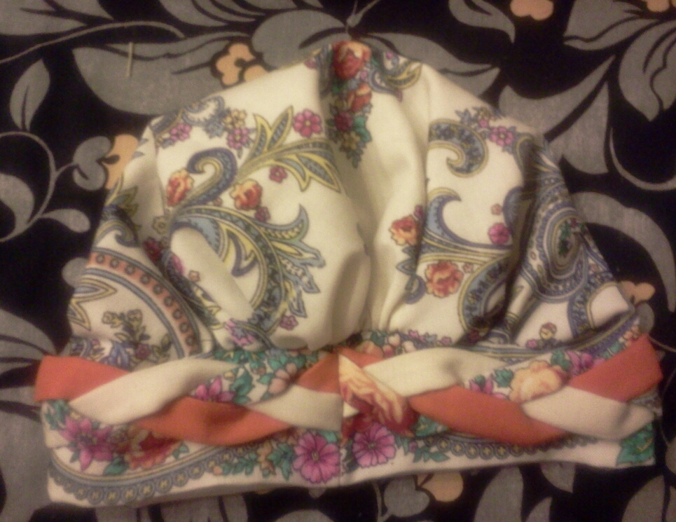 А я сегодня от бессонницы сшила из лоскута Милого друга (купленного за смешные денежки) вот такую шапочку. Идея не моя, подсмотрена в любимом магазине русских платков.