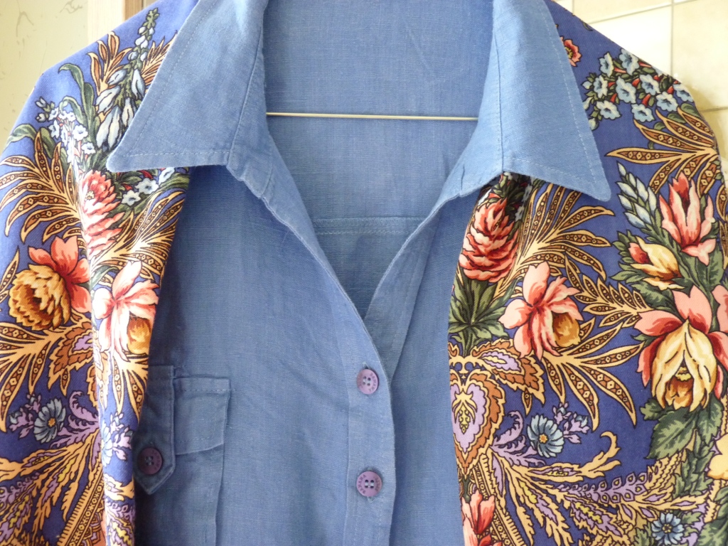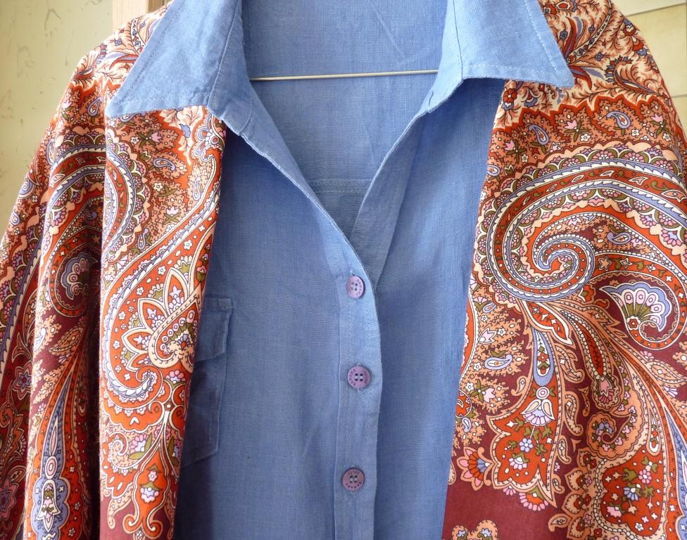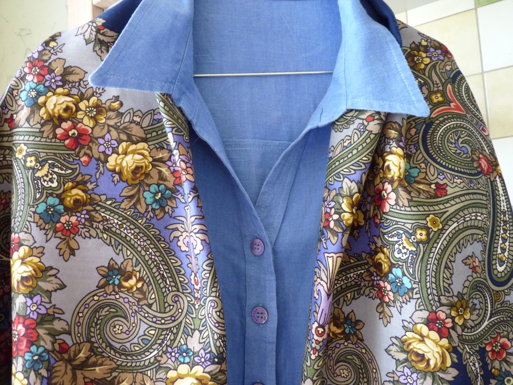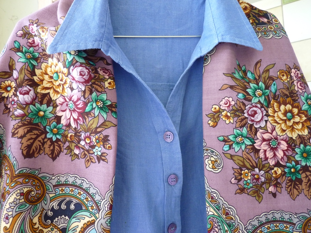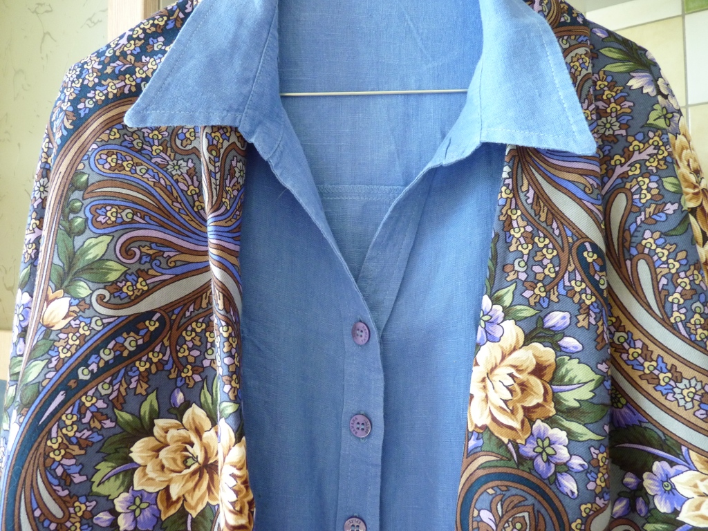 Достался мне тут летний льняной брючный костюм, василькового, кмк, цвета. Нафотала с ним шалей - на случай если в этом костюме на меня северным ветром сильно подует. :)