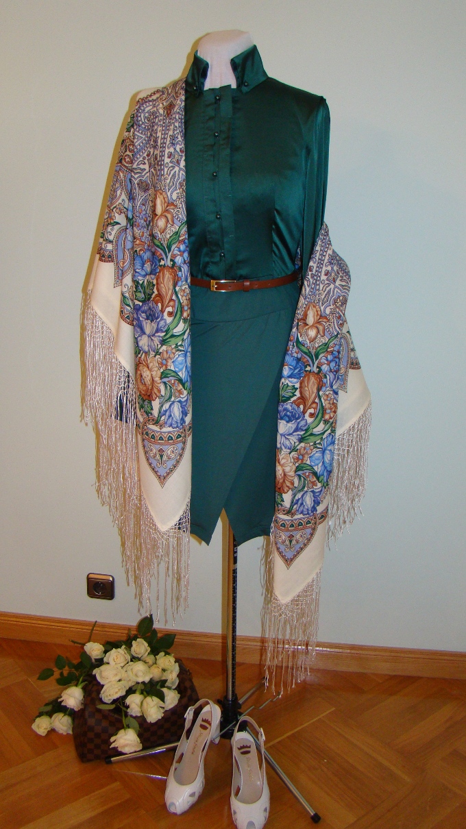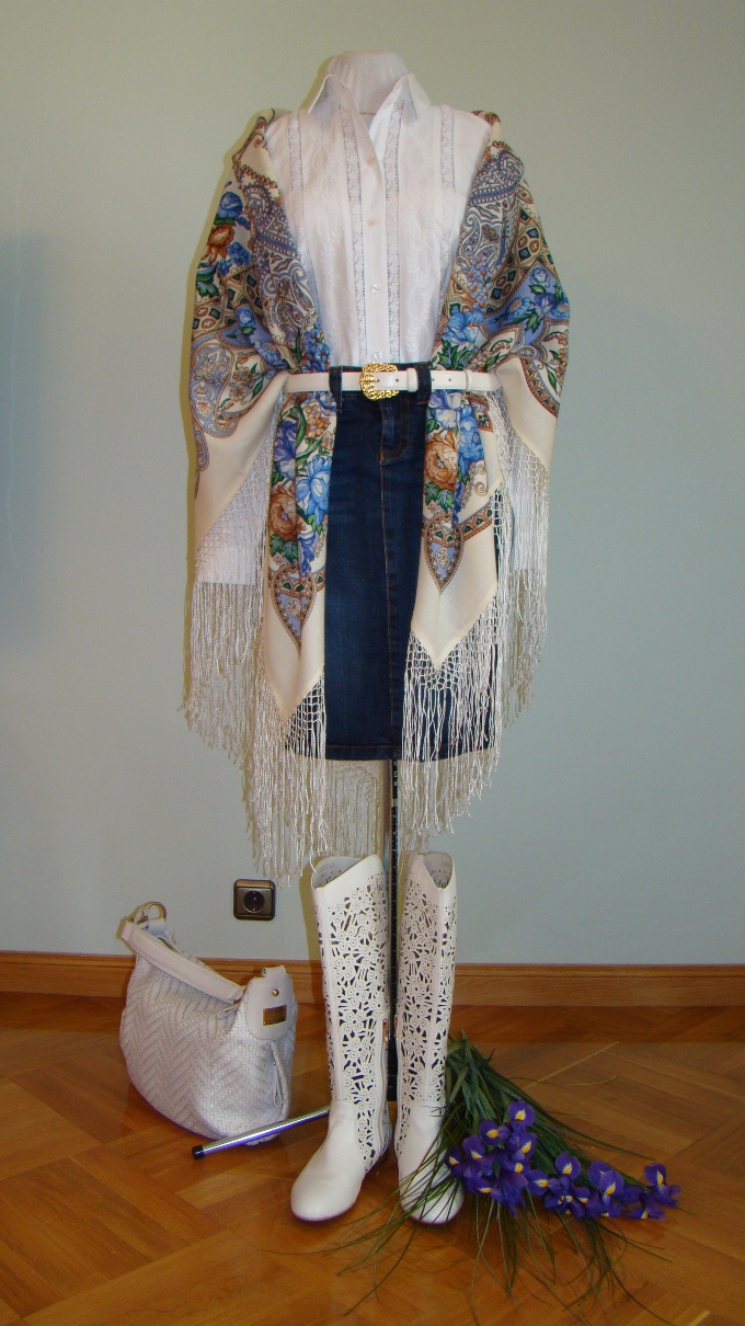 Нежданный белопольный Княжеский вызвал неожиданную реакцию – кому-то показался недокрашенным, кому-то – слишком простым, а меня неожиданно очаровал. При безумной любви к разноцветным шалям, очень не хватало чего-то более спокойного, почти монохромного, сдержанно-нежного. А при личной встрече оказался он достаточно ярким, но очень изящным, изысканным, но чуточку капризным … «трепетным» назвала его моя приятельница. Сразу представился в элегантном комплекте с классическими костюмами из шерсти, васильковой или «цвета слоновой кости» ; с велюровым белым пальто и непременно синими перчатками (как у Ванессы); или с легким платьем из голубого кружева или шитья, и чтобы юбка «летящая»; или со светлым платьем в пол в «ампирном» стиле; а ещё с бесподобными вязаными юбками и платьями ( как у Брусники и других наших рукодельниц)…