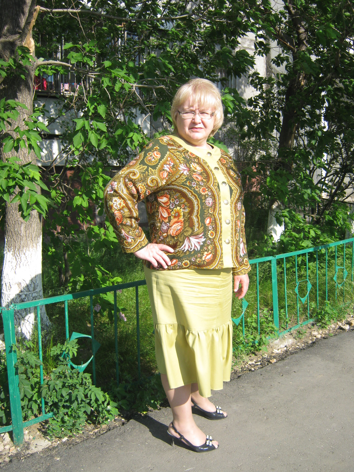 Eva, я почему-то давно не ношу просто прямых юбок. Все стараюсь купить какие-нибудь с драпировками, или двухслойные, или в несколько ярусов. (Кликните, чтобы почитать оффтопик)... Да и ткань эта слишком мнется, несмотря на подкладку. Мне подумалось, что прямая юбка будет больше мяться и иметь еще худший вид, чем эта. Может быть, сшить еще и "годе". В этом же магазине продавался и зеленый лоскут такого же качества, по цвету попадающий в цвет зелени жакета.