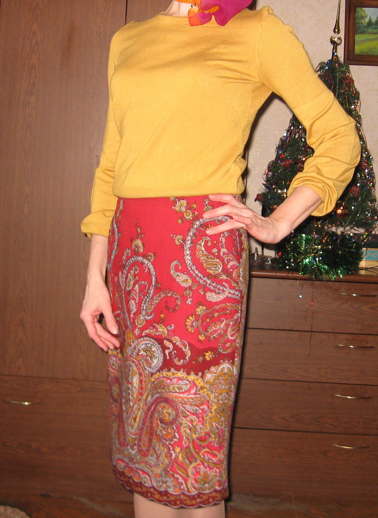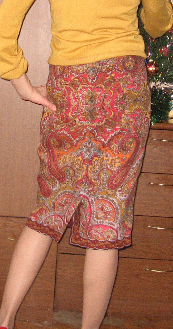 Да я перед раскроем раз сто лоскут на себе вертела-примеряла. Мне тоже показалось, что асимметричный рисунок интереснее смотрится. Но тут вступает в игру зрительный эффект: при асимметричном рисунке на переднем полотне юбки один бок смотрелся длиннее другого. Быть может, это свойство именно этого рисунка - "Каравана"?